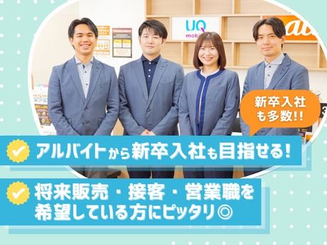 資格 <90%以上の方が未経験スタート♪> au・UQユーザーでなくてもOK!! ◆高校卒業以上の方 ◆ハローワークで求職中の方にもおすすめ! ◆土日勤務できる方 <こんな方もぜひ!> ◇未経験でも始められる仕事がいい ◇接客・販売スキルを活かしたい ◇安定して長く働きたいetc. <色々なお仕事経験も活かせます> ドコモ・楽天・ソフトバンク・ワイモバイルなど他キャリアの経験がある方も歓迎! - 【従業員の声!】 20代学生Aさん (入社3年目 大学生) ・志望動機 「就職活動に役立つ能力が身につく」と書いあり、携帯ショップのアルバイトは貴重な経験が出来ると思い応募しました。 ・身についたスキルは? お客様が希望するニーズを引き出さないといけない為、コミュニケーション能力が1番身につく。 現在就職活動をしており、グループディスカッション等で身につけたコミュニケーション能力が役に立つ。 ・携帯販売のおすすめポイントは? お客様から感謝された時にやりがいを感じられます!!