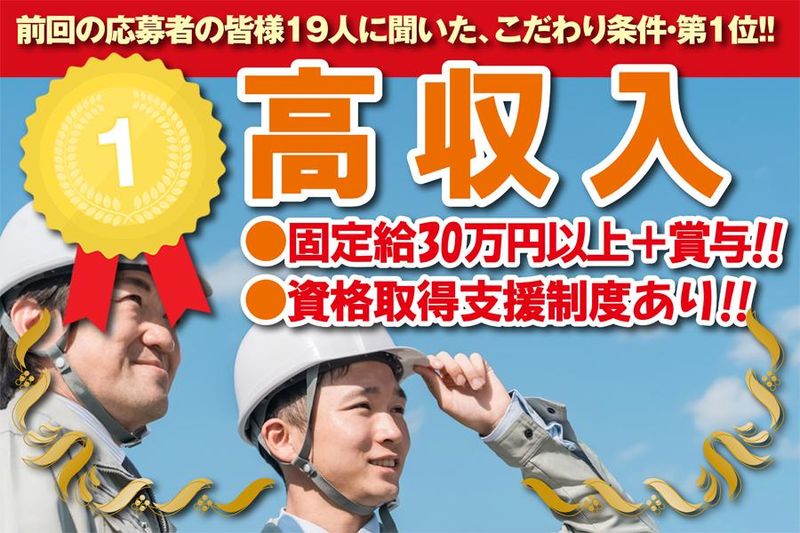 月給300,000円以上 給与詳細 ※基本給・固定残業代の総額 基本給:月給 23万7000円 〜 固定残業代:あり 1ヶ月あたり6万3000円 〜(固定残業時間:1ヶ月あたり42時間) 固定残業時間を超えた勤務時間については別途残業代を支給する 【一律手当】 全員に一律で支払われる通勤・皆勤・家族手当金額:なし 全員に一律で支払われるその他手当金額:なし ⭐上記30万円は、経験者の最低保証額 です。 ◎あなたの経験・実力・資格・前給等を 考慮の上、優遇します。 【有資格者の皆様】 ・1級建築施工管理技士の方 ・1級土木施工管理技士の方 ・一級建築士の方の方 ⭐月給40万円(最低保証額)以上 ・2級建築施工管理技士の方 ・2級土木施工管理技士の方 ・二級建築士の方 ⭐月給35万円(最低保証額)以上 【手当】 ◎下記手当を別途支給します。 ・残業手当:超過分 ・通勤手当および交通費:全額支給 (ETCカード・ガソリンカード支給) ・車両手当:マイカー使用の場合 ・現場手当 【昇給】 年1回 【賞与】 年2回 ◎2025年実績:3.0カ月 【給与例】 給与例 【年収例】 30代・2級建築施工管理技士 600万円(月給40万円+手当+賞与) 40代・1級建築施工管理技士 750万円(月給50万円+手当+賞与) 50代・1級建築施工管理技士 900万円(月給60万円+手当+賞与)