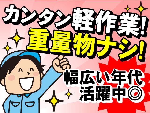 仕事内容 <簡単!冷蔵庫内作業> \保冷ボックスの組立スタッフ大募集/ モクモク作業でしっかり稼げる!未経験OK! <お仕事内容> 「保冷ボックスの組み立て」を行う シンプル作業です! ◎部材を組み立てるだけの簡単作業! 難しいことは一切なし!すぐに覚えられます ◎未経験の方でも安心 丁寧なサポート体制あり! <働く環境> ・モクモク作業が好きな方にピッタリ! 周囲に干渉されず自分のペースで働けます◎ ・フォロー体制万全!困った時はすぐ聞ける環境です ・20代~50代まで幅広く活躍中! ・フリーターさん、Wワーカーさんも大歓迎! <ココがPOINT!> ・人気のカンタン軽作業!スグに始められる ・仕分け担当も経験できる!成長できる職場◎ ・体を動かしたい方におすすめ! 重い物はありませんがよく歩きます! <こんな方におすすめ!> 黙々作業が得意 or 好き 体を動かすのが苦じゃない 単純作業でしっかり稼ぎたい 時間を有効活用して働きたい \誰にでもできるカンタン作業!/ 年間を通して安定した収入を得られます。 快適に仕事に取り組んでいただける環境を 整えていますのでお気軽にご応募ください。 人気の倉庫ワーク、はじめてみませんか?
