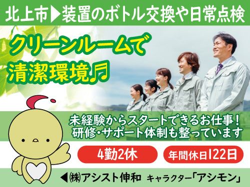 仕事内容 岩手県花巻市にある企業にて勤務いただく 部品の管理作業スタッフ大募集! 【オススメポイント】 〇交替勤務でしっかり稼げる! 〇簡単作業なので未経験者も歓迎! 〇年間休日122日あり! 〇交替制でしっかり稼げる! 「お仕事内容」 ・半導体製造装置に薬液の入ったボトルを セット・交換する作業を行います。 ・タブレットを使用し、半導体製造装置に 異常がないかチェックする点検作業を行います。 \クリーンルームなので清潔な環境 / クリーンスーツ着用の作業です。 クリーンスーツは派遣先様にてご用意 いたしますのでご安心下さい。 「収入もバッチリ!」 時給は1,320円! 交代勤務しっかりと稼ぎたい方必見! 月収21万円以上のお仕事です。 「プライベートの時間も充実!」 4勤2休なので、年間での休日日数は多めです! 平日休みは通院や市役所・銀行お手続きなどで 有効に活用できると好評です!ご家族との時間や ご自身の趣味に時間を使いながら、無理なく働けます。 「働きやすさ」で選ぶなら「アシスト伸和」にお任せください! 他にも多数お仕事がございますので、あなたに合ったお仕事探しが可能です。 ぜひ一度お気軽にご連絡ください!