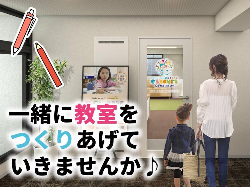 仕事内容 < Osaka Metro運営の学童保育 > ―――――――――――――――――― <職場紹介> 「えすこーとOsaka Metro都島駅前校」 プログラミング・書道・英語 絵画造形・算数などの習いごと付き 民間学童です。 子どもたち一人一人の好奇心を ゆっくり育み、自主性、社会性、 創造性やコミュニケーション力、 表現力、問題解決力など、 様々なスキル習得のための サポートを行っています。 週1回のミーティングがあるので、 フォロー体制はバッチリ! お困り事があれば 何でもご相談くださいね◎ 子どもたちの長期休み期間には イベントや遠足も実施します。 遠足先の中にはOsaka Metroの施設もあり 他の学童とは違う楽しさも♪ 「今日は○○ができるようになったんですよ」 保護者の方とのコミュニケーションで 子どもたちのできたことや 経験したことを共有! 一緒に成長の喜びを分かち合いましょう◎ ―――――――――――――――――― <仕事内容> えすこーとOsaka Metro 都島駅前校 教室長 ◇教室長としての業務 ・子どもたちや保護者の方との コミュニケーション ・入退会時の面談や問い合わせ対応、 各種手続き ・スタッフの育成、シフト・勤怠管理 ・教室運営に伴う数値管理 ・新規集客、プロモーション企画および実行 ・各種習いごとのサポート ・宿題や塾用テキストでの学習指導 ・学童保育の環境整備 ・送迎業務 ◇その他、教室運営業務全般 日によりますが、 生徒数10~30名に対して、 スタッフ2~6名で対応します。 対象児童は幼児(年長)から小学6年生。 講師1名につき生徒5名を 担当する少人数制で、 しっかり子どもたちと 向き合うお仕事です。 <保育方針> 当施設では、子どもの成長に沿って 学力・コミュニケーション能力をはじめ 表現力・問題解決力などを 育んでいけるように 手厚い保育体制と習いごと を用意しています。 学校の宿題もしっかりサポートしながら、 放課後の時間が子どもたちの 将来に結びつくような 有意義な時間となるよう スタッフ一同取り組んでいきます。 ※大阪市阿倍野区にも新規校舎オープン予定! 新規校舎でお仕事して頂く場合もあり