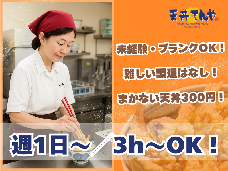 仕事内容 ╭━━━━━━━━━━━━━━━━━╮ お迎え前に帰れます/急な休み相談OK 家庭優先のまま、久々に働きたい方へ ╰━v━━━━━━━━━━━━━━━╯ ⭐\主婦(夫)がたくさん活躍中!/⭐ ⏩難しい調理はなし! マニュアル完備で安心して働けます ⏩ 昼間のスキマ時間で 家事や育児と両立しながら サクッと働ける1日3h~ 「子どものお迎えに行く前に帰りたい」 「家事の合間に働きたい」 「久しぶりの仕事復帰で、短時間から始めたい」 そんな方を歓迎します♪ ⏩ 扶養内勤務もOK! 子供が大きくなったらフルタイムで… などもOKです! ⏩ ブランクがあっても安心のサポート体制 先輩がイチから丁寧に指導するので 久しぶりのお仕事でも安心して働けます。 ⏩ ランチ補助ありで家計も助かる♪ 人気天丼が【300円】で食べられます ⏩ 車通勤OK!無料駐車場完備 駅からのアクセスを気にせず、 買い物や子どもの送り迎えにも便利♪ ー・ー・ー・ー・ー・ー・ー・ー・ー・ー <お仕事内容> 日本の天ぷら料理を提供する人気チェーン 「天丼てんや」でキッチン業務をお任せ! ⏩ 調理業務(オートフライヤー使用) オートフライヤーを使用するため、 未経験の方でも簡単に調理できます。 <調理の流れ> ①衣をつける ②オートフライヤーに入れる ③取り出して盛り付け ⏩ 洗い場業務(食器洗浄機使用) 食器洗浄機を使用するので、 効率よく作業できます。 <洗い場の流れ> ①食器を分類してセット ②食器洗浄機に入れる ③洗浄後の食器を所定の場所へ戻す <安心ポイント!> ⭐マニュアル完備で未経験でも安心 ⭐先輩スタッフが丁寧にサポート ⭐分からないことはすぐ相談できる環境 ー・ー・ー・ー・ー・ー・ー・ー・ー・ー <✅ 週1日~、1日3h~OK> 「子どもの送り迎えに間に合うシフト」 「午前中に働いて午後は家事に専念」 など、家庭と両立しながら頑張る 主婦さんも多数活躍中です! さらに【休みやすさ】も抜群! お子さんの急な体調不良や 学校行事などにも柔軟に対応! ー・ー・ー・ー・ー・ー・ー・ー・ー・ー <✅先輩インタビュー> 主婦Aさん/30代 「子どもが小学生になって、 少し自分の時間ができたので、 久しぶりに働こうと思いました。 シフトが柔軟で、昼間の ランチタイムのみの勤務もOK だったので、家事や子育てとの 両立がしやすいです。 時給も高めで、交通費や 食事補助もあり、家計にも 助かっています! 先輩方も優しくて、 未経験の私にも丁寧に 教えてくれるので 安心して働けています。 久々の仕事復帰ですが、 無理なく続けられて、 やりがいを感じています。」