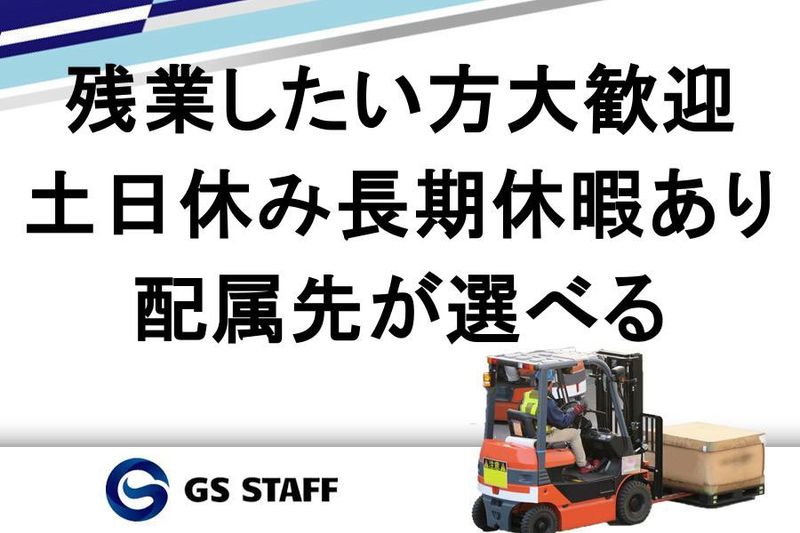 【仕事内容】 フォークリフトの経験者の方はご応募ください! ■■■おすすめポイント■■■ ✅配属先が選べる! ✅日勤帯のみのお仕事 ✅土日休み、長期休暇あり ✅色々なリフト作業から選べる 【具体的な仕事内容】 自動車部品の大型倉庫でフォークリフトを使った入出庫作業のお仕事です。 ▶リフトで部品の格納・出荷ピッキング ▶カウンターやリーチ、ピッカーなど様々 ▶作業割合はリフト2割・手作業8割 【職場見学・1日体験OK】 働く環境を事前に確認できるので、ミスマッチなく始められます。不安がある方も、まずは見学だけでも大丈夫です。 【安定勤務を支える、安心の職場環境】 多事業展開で成長を続けるGSホールディングスのグループ企業です。安定した基盤のもと、安心して働けます✨ ■■■生活で助かる制度あり■■■ ✅定着支援制度あり(規定) ✅週払いOK (入社1週間後から最短翌日に振り込まれます) ■■■キャリアアップをサポート■■■ 今の経験を活かしながら、さらにスキルアップできる環境です。 ✅資格取得支援制度あり ・大型免許 ・中型免許 ・フォークリフト免許 「もっと稼ぎたい」「もっとできることを増やしたい」という思いに応えるため、資格の取得をサポートする体制を完備!(在籍1年以上の方が対象) ✅AI研修あり(スマホでOK) 誰でも使えるAIの基本操作を学べます。 作業手順の最適化や、日報の文章作成など、仕事の効率化にも役立つ内容です。 困った時に「すぐ調べられる力」が身につくので、未経験の方でも安心してスタートできます。 ―――――――――――――― 現場経験者の担当者がしっかりサポートするので、困った時もすぐ相談できます。 有休取得率90%以上で、プライベートも大切にできる環境です。 選んでくれた方に「この会社で良かった」と思ってもらえるよう、働きやすさを追求しています。 ―――――――――――――― 【求人ID-RGN001】