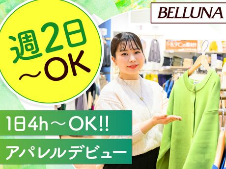 仕事内容 ベルーナのアパレル店舗スタッフ ■■ 通販ベルーナの実店舗 ■■ アルバイト・パートアパレル販売スタッフの募集! 主婦パート・学生・フリーター活躍中♪ ―――――――――――――――― 【 募集時間帯 】 12:30~21:30(実働8h/社保可) 17:30~21:30(実働4h) ★いずれも18時以降は時給1,200円! ―――――――――――――――― <こんな方歓迎♪> お子様が高学年になって手が離れた… →勤務時間を伸ばして収入UP! →久しぶりのアパレル復帰! →今だからこそアパレル挑戦! ★週2日~OKだから体力にも余白をもって勤務◎ <未経験OK♪> 週2日からOK!扶養内勤務OK! 家事や育児終わりに勤務OK◎ 平日のみ(土日祝休み)・土日のみOK! 接客販売が初めての方も大歓迎! 個人ノルマなし!髪色自由&ネイルOK♪ 履歴書不要で面接OK! 短期から始めて長期への切り替えもOK!即日勤務OK! ◎仕事内容 夕勤の場合は、館にいらっしゃるお客様も少ないため、 商品陳列・整理、品出し等、が メイン業務となります。 ★商品陳列・整理 ★入荷処理 ★品出し・補充 ――――――――――― ◎お客様がいらしたら・・ ★販売・接客 ★レジ対応 ★試着やお探しの商品のご案内もあります。 ――――――――――― 閉店後は・・ ★クローズ作業(レジ締め・清掃など) 先輩スタッフのフォローがあるので安心◎ お店で活躍している方の約8割が未経験からのスタート! 自分で考えたコーディネイトをSNSで発信する事もできちゃう☆彡 【ベルーナグループ!】 ■現在全国に70店舗以上展開している カタログ通販でおなじみ「ベルーナ」のショップです! ■カタログ通販やネット販売で人気のリーズナブルで着回しのきくアイテムや、 店舗限定アイテムも多数取り揃えています。 ★面接時のPOINT★ 【面接1回】で完結♪♪ 入社日は相談の上、決定します。ご希望をお聞かせください◎ <面接での質問内容をご紹介>※店舗により多少異なります ・カンタンな自己紹介 ・なぜBELLUNAにご応募いただいたか ・今までどんなお仕事を経験してきたか(もちろんアルバイトデビューもOK♪) ・ご希望のシフトや出勤日数・曜日など ・いつから働きたいか ◎面接といっても、堅苦しくない面談のようなスタイルで実施しますので、緊張せずにご参加ください! ◎履歴書不要!面接にお越しいただいた際に、アンケートシート(5~10分)の記入をお願いしています♪ ※アンケートシート(5~10分)+面接20~30分程度を予定しています!
