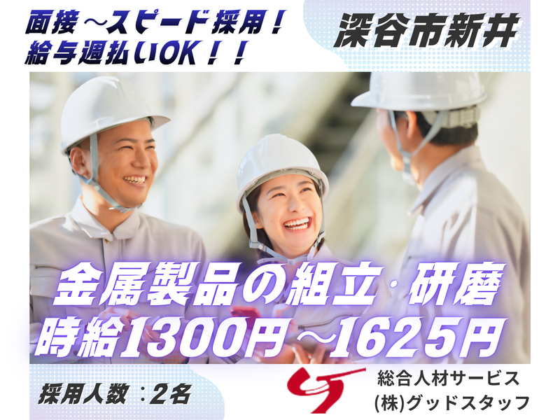仕事内容 △▼△▼△▼△▼△▼△▼△▼△▼△▼△▼ \未経験OK/ “つくる”を支える金属加工ワーク。 研磨から組立まで、着実にスキルが身につく仕事。 埼玉県深谷市新井にある製造工場にて、 金属製品の研磨・組立を行うスタッフを募集。 扱うのは、生活や産業のさまざまな場面で 使われる金属パーツ。製造の一端を担うやりがい、 手順を覚えるごとに上達していく楽しさを味わえる仕事です。 「工場は初めて…」という方でも、 1つずつ丁寧に覚えていけるよう、 現場全体でフォローします。 △▼△▼△▼△▼△▼△▼△▼△▼△▼△▼ ■お仕事内容 金属製品の仕上げ加工から組立まで、複数の工程を担当していただきます。 どれも難しすぎる作業はなく、未経験の方も取り組みやすい内容です。 ✅電解研磨(機械操作) 専用の機械に金属製品をセットし、表面をきれいに仕上げます。 電気の力を使った研磨で、表面をなめらかにする、 余分な部分を除去するといった作業を行います。 機械が自動で研磨するため、 セット→ボタン操作→完了品の取り出しの シンプル工程です。 ✅コーキング作業・清掃 研磨後の金属製品に、必要に応じてコーキング材 を流し込み、仕上がりを整えます。 その後、製品に付着した汚れを除去し、きれいな状態へ。 細かい作業ですが、慣れるほど効率が上がり、 「きれいに仕上げられた!」と実感できる工程です。 ✅ネジ締めによる組立 電動工具を使って、金属部品を組み付けていきます。 ネジ締め作業が中心で、手順書に沿って進めるため安心です。 製品が形になっていくのを見るのは、 組立作業ならではの達成感があります。 ■ この仕事の魅力 ◎ 未経験でも始めやすいシンプル工程 機械操作・研磨・組立と聞くと難しく感じるかもしれませんが、 実際には“マニュアル通りに進めればOK”の作業ばかりです。 ◎ モノづくりのスキルが自然と身につく 電動工具の使い方 金属の扱い方 加工や仕上げの基礎知識 これは実務でしか学べない貴重な経験です。 ◎ コツコツ集中して進めるのが好きな方に向いています 目の前の作業に丁寧に取り組む方が活躍中。 静かに集中して働ける、落ち着いた工場です。