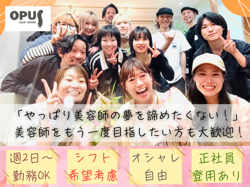 仕事内容 「美容師、もう一度やりたい」 でも、以前と同じ働き方は不安…。 そんな方の“再スタート”を応援するサロンです。 ⭐まず知ってほしい【3つの安心ポイント】 ●週2日~・1日5h~OK ●できる技術だけ担当(無理な工程なし) ●練習・残業の強要は一切ありません 「家庭と両立しながら」 「扶養内で少しずつ」 そんな働き方を大切にしています。 ========== <仕事内容> ケアリスト・カラーリストとして、美容師のアシスタントのお仕事。 具体的には… ✅シャンプー ✅トリートメント ✅スパ ✅カラーリング ✅パーマ ✅ストレートパーマ ✅スタイリング・ブロー ✅ヘアケア など ブランク明けの方は、まずはシャンプー・スパ・トリートメントなど、 “できること”からお任せします。 経験・希望に応じた業務を担当していただくので、無理に工程を増やすことはありません。 「久しぶりで不安…」 そんな気持ちを理解した上で、サポートする体制が整っています。 ◆入社後に職種変更の相談OK! ========== <美容師をもう一度目指したい方も大歓迎!> 「美容室で勤務したけど、現実とのギャップに心が折れてしまった…。」 そんな方も、ぜひ当社で再チャレンジしてみませんか? 一度業界から離れても、資格をお持ちであれば大丈夫です♪ 一からしっかりサポートしますのでご安心ください。 当社は誰もが楽しく働ける環境をご用意! 明るく楽しい雰囲気だけでなく、無理なく・長く続けられる体制を整えています。 「3年後にはどうなっていたいか?」などの将来像も明確にイメージできるように成長をサポート。 夢を諦めずにチャレンジしたい方を応援します! <復帰の不安、全部相談してください> ・急にモデル練習はありません ・営業時間外の強制練習なし ・若手ばかりのギスギスした雰囲気なし 実際に、結婚・出産後に復帰したスタッフも活躍中! ========== <配属について> 入社後は下記のどちらかの店舗に配属予定です。 ⭐HAIR WORK OPUS 吉祥寺 東京都武蔵野市吉祥寺本町2-14-25 第二マーブルビル3F 「吉祥寺駅」より徒歩10分 ●お客様の層 :30代~50代の女性が多め ●店舗について:リニューアルした本店 ⭐OPUS AMICA 吉祥寺 東京都武蔵野市吉祥寺本町2-8-1 877bld.2F 「吉祥寺駅」より徒歩7分 ●お客様の層 :若年層が多め ●在籍中の美容師:20代活躍中(6名在籍) ●店舗について :こじんまりした店舗