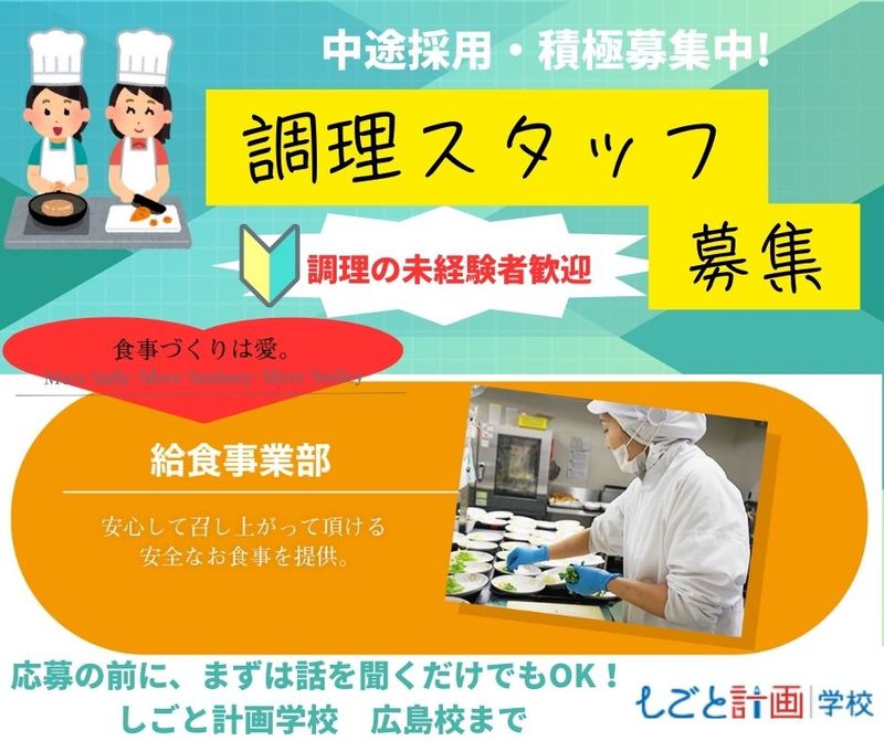 仕事内容 【具体的には・・・】 ・調理、盛付、加工、配架 ※1回につき70食程度 ・食器および器具洗浄 ・厨房内清掃 まずは簡単な盛付等から スタートしていただき、 慣れてきたら調理等もお願いします 一通りの業務ができるようになるまで しっかりサポートいたします◎ ========== ●当社の給食事業部では、 広島市、呉市、東広島市にて 病院・老人福祉施設・学校など 25施設に給食業務を行っています ========== ※お仕事番号/Chr1563-006