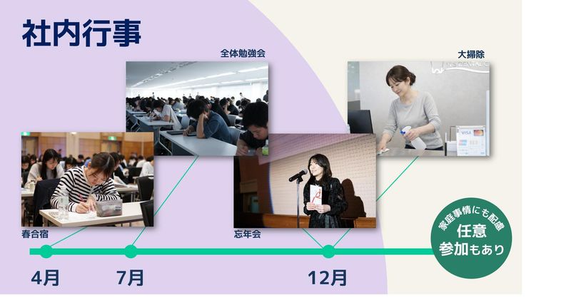 休日休暇 完全週休2日(シフト制)、祝日 夏季休暇、冬季休暇、介護休暇、育児休暇、産前産後休暇 有給休暇(1年目10日、2年目11日、3年目12日~) *スタッフ数が多いので、有給も取りやすい環境です *週4勤務や土日休みなどご相談可能です