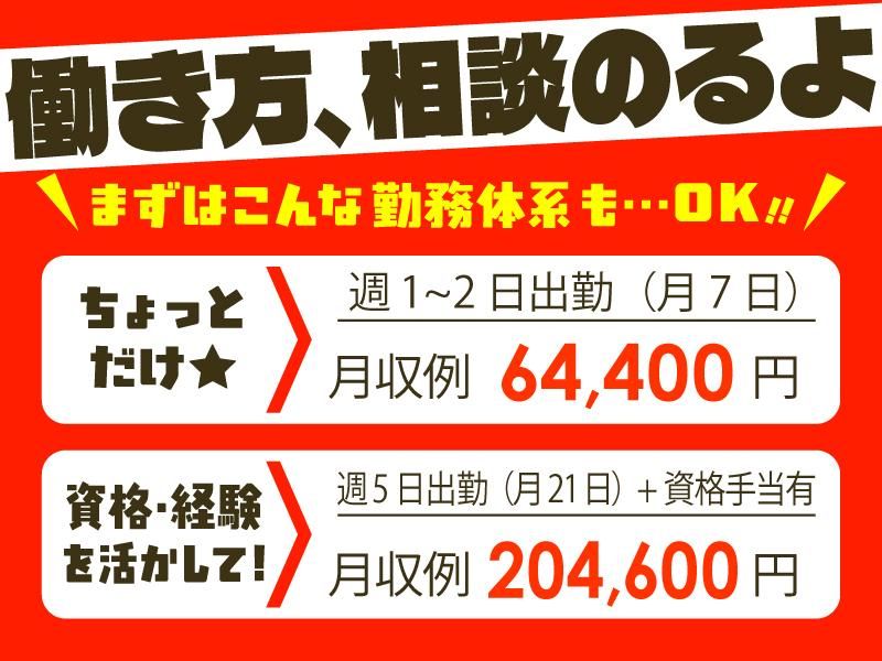 日給9,200円~9,800円 給与詳細 基本給:日給 9200円 〜 9800円 固定残業代:なし 【一律手当】 全員に一律で支払われる通勤・皆勤・家族手当金額:なし 全員に一律で支払われるその他手当金額:なし 日給は1日8時間労働が基本ですが、短くなっても日給は下がりません! 【給与例】 給与例 <週6勤務でしっかり働くと…> (※資格・経験有の場合) 日給9,800円×25日=245,000円 +資格手当(月額3,000円) =月収例:248,000円!! <他にも働き方、相談のります> (※週末1~2日間だけ働きたい) 日給9,200円 週1~2日出勤 7日勤務 日給9,200円×7日=64,400円 (※資格を活かしてしっかり働きたい) 日給9,600円×21日=201,600円 +資格手当(月額3,000円) =204,600円