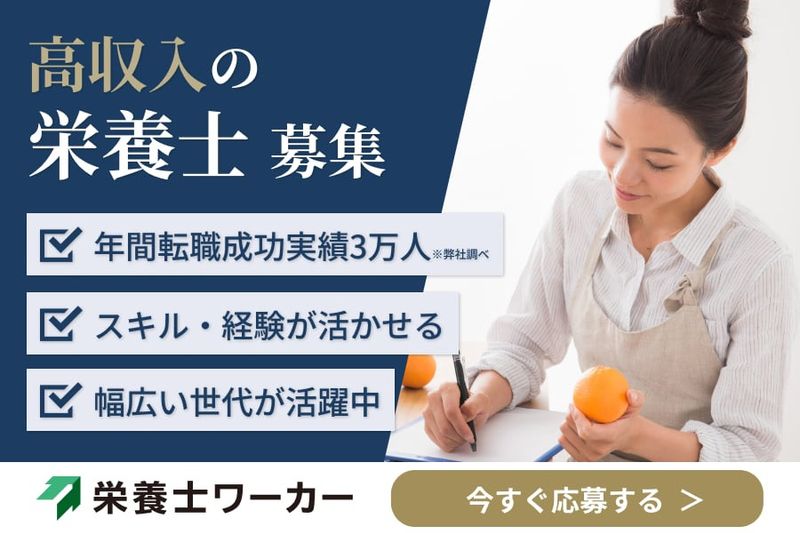 【アピールポイント】 《栄養士ワーカーとは?》 栄養士ワーカーは、管理栄養士、栄養士、調理師の転職に特化しております。 サービス利用者数12万人以上と皆様に安心してご利用いただけます。 専門のアドバイザーがしっかりサポートいたしますので、初めての転職でも安心してご利用いただけます。 転職・就職をお考えの皆さまを完全無料でサポートしており、面接対策や同行、エントリーシートのチェック、 施設の口コミなど他社にはない細かなサポートを行っております。 栄養士ワーカーでは管理栄養士、栄養士、調理師に特化した求人情報、非公開求人を毎日更新しております。 【求人ID】 390846