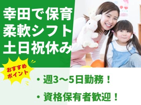 仕事内容 \ここがポイント/ ★熊本県熊本市南区幸田での子育て支援員または保育士のお仕事! ★子育て支援員または保育士資格をお持ちの方歓迎! ★土日祝休みで、週3日~週5日の勤務が可能! *・。・。*・。・。*・。・。* <仕事内容> 保育園または子育て支援施設で、子どもたちの生活サポートや、 遊びや学びを通じた成長支援を行うお仕事です。 具体的には、食事やお昼寝、遊びの時間のサポート、 保護者との連絡帳の記入など、子どもたちに寄り添ったケアを提供します。 また、子育て支援員としては、保護者への育児相談対応も行います。 ◎週3日~5日で働けるので、ライフスタイルに合わせて勤務日数を調整可能! 土日祝休みでプライベートも充実できます!◎ *・。・。*・。・。*・。・。*