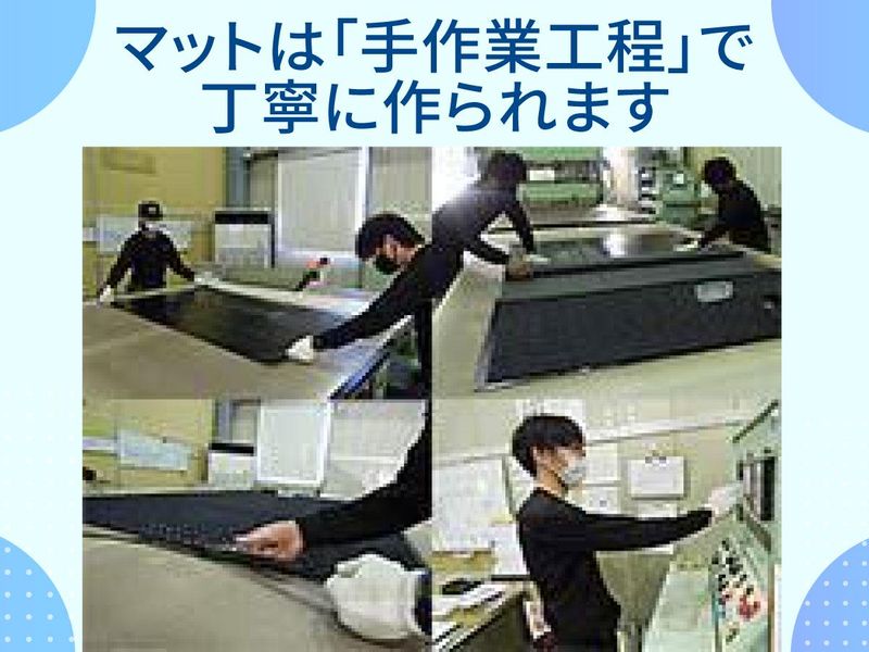 仕事内容 【三和テクノってどんな会社?】 1965年の設立以来、三和テクノは「世界一のシールメーカーになる」ことを目標に、全社一 丸となって分野を問わず「シール材」の開発・設計・製造・販売を行ってまいりました。取引先は、大手優良企業が中心(自動車やOA機器関連など多数)。安定した経営基盤のもと、安心して働いていただけます。また専業メーカーとして真摯に製品開発に取組み、現在では国内42件、アメリカ11件、中国6件など、業界では屈指の特許数を取得。高度な性能・品質を求められるお客様に満足頂ける製品の開発・提案に努めています。 ■デザインマットの裁断・加工・出荷などの製造業務全般を担当します。 【具体的な仕事内容】 姫路工場では、飲食店やショップ・ホテルなどお客様を出迎える様々な場所で使われる「玄関マットとデザインマット」を製造しています。ここ姫路工場で1つ1つ「手作業工程」で丁寧に作られるマットは7年~10年という高い耐久性に定評があります。ひとりで黙々と機械に向き合っていく製造とは違い、2名~4名でチームを構成し、チームワークで進めていく仕事ですので実務の中で仕事を覚えていけます。先輩や上司がしっかりフォローしますので、未経験の方でも基本から1つ1つ学びそして経験し成長することができます。そして一緒にモノづくりを楽しみましょう。近い将来、あなたには姫路工場の製造正社員の中心的メンバーの一人として活躍してもらえればと考えています。また主体的に仕事に取り組める方には、昇給・昇格のチャンスが多い職場でもあります。 【入社後のイメージ】 ご入社後は、いきなり難しい作業をお任せすることはありません。まずは、約1ヶ月~2ヶ月かけて、各製造工程をローテーションで回りながら研修を行います。製品がどのように作られているのかを一つひとつ学び、職場の雰囲気にも少しずつ慣れていただけます。その後、ご本人の希望や適性を考慮し、担当する工程を決定します。配属後は、先輩社員がそばにつき、約3ヶ月間、実務を通して丁寧に指導します。分からないことはすぐに聞ける環境なので、未経験の方も安心です。入社から半年ほどでの独り立ちを目標に、無理のないペースで成長をサポートしていきます。 ■危険な作業はないため、ヘルメットも不要です。機械を動かすのは、マットとゴムを圧着する大型熱プレス機を動かすときだけ。熱を発する機械なので体感温度はグッと上がります。姫路工場は総勢約25名で、20代~60代まで幅広い社員が揃っています。