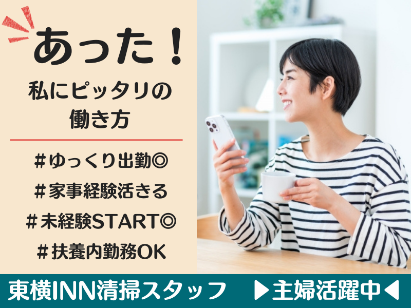 仕事内容 家事も、収入も、無理なく両立。 ================== 家計の足しに働きたいけど、 それで生活がツラくなるのは困る… 主婦さんの迷うところだと思います。 東横インの清掃スタッフは、 ✅10時〜15時だけ ✅週4日~OK ✅接客ナシで作業に集中 と、ストレスや負担なく暮らしと両立OK! お仕事は久しぶり、という方も ムリなく始められますよ♪ ⏰ 家庭と両立しやすい固定シフト  ̄ ̄V ̄ ̄ ̄ ̄ ̄ ̄ ̄ ̄ ̄ ̄ ̄ ̄ ̄ ̄ ̄ ̄ 勤務は【10:00〜15:00】の5時間のみ。 朝の家事や見送りを済ませて出勤、 退勤後は余裕をもって買い物やお迎えへ。 月に2回以上、土曜または日曜の 勤務ができる方を募集。 それ以外は平日中心のシフトなので、 生活リズムを崩さず無理なく続けられます。 ✅ 接客なし・モクモク作業  ̄ ̄V ̄ ̄ ̄ ̄ ̄ ̄ ̄ ̄ ̄ ̄ ̄ ̄ ̄ ̄ ̄ ̄ ベッドメイク、清掃、備品補充など、 シンプルな客室清掃が中心。 基本は1人作業なので、 人に気を遣わず自分のペースで進められます。 特殊なスキルも不要で、 家事経験がそのまま活かせるお仕事です。 ✅ 未経験・ブランク歓迎  ̄ ̄V ̄ ̄ ̄ ̄ ̄ ̄ ̄ ̄ ̄ ̄ ̄ ̄ ̄ ̄ ̄ ̄ 最初は先輩スタッフが横について、 手順やコツを丁寧にレクチャー。 久しぶりの仕事復帰でも、 安心してスタートできます◎ ✨ 昨年11月オープンの新しいホテル  ̄ ̄V ̄ ̄ ̄ ̄ ̄ ̄ ̄ ̄ ̄ ̄ ̄ ̄ ̄ ̄ ̄ ̄ まだ新しく、清潔感のある きれいな職場環境です。 気持ちよく働けると、スタッフからも好評◎ 生活リズムを崩さず働けて、 月収11万円以上+社会保険加入。 家計も将来も、しっかり支えられます。 ⭐応募方法  ̄ ̄ ̄ ̄ ̄ ̄ ̄ ̄ ̄ ̄ ✨直接採用担当とお話ししたい方 →電話での応募大歓迎! 03-3871-6145 までお気軽にお問い合わせください! ✨【応募】ボタンから応募の方 →エントリー後、担当者からご連絡差し上げます。
