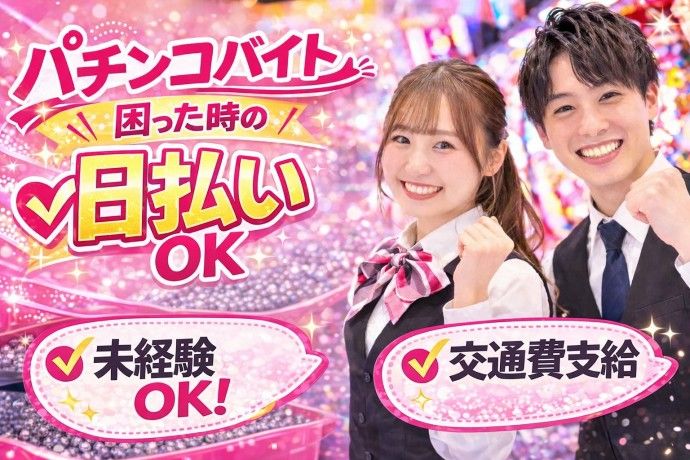 仕事内容 「いらっしゃいませ~」と笑顔でお客様をお出迎え! 快適な空間づくりが大切なお仕事です! 【ホール業務】 -ホールの巡回 -出玉やコインの計数 -おしぼり交換 -台のトラブル対応 (難しいトラブルは、先輩STAFFが対応します!) 【カウンター業務】 -店内アナウンス、お客様のお呼び出し -景品交換 -景品の整理・管理など パチンコバイトが初めての方でも、パチンコで遊んだ方が無い方でも、 先輩たちが丁寧に教えてくれるので安心ですよ! ※お友達同士の応募もOK! ※20代~30代の男女活躍中の職場です ※社内規定内であればネイルOK、髪色自由