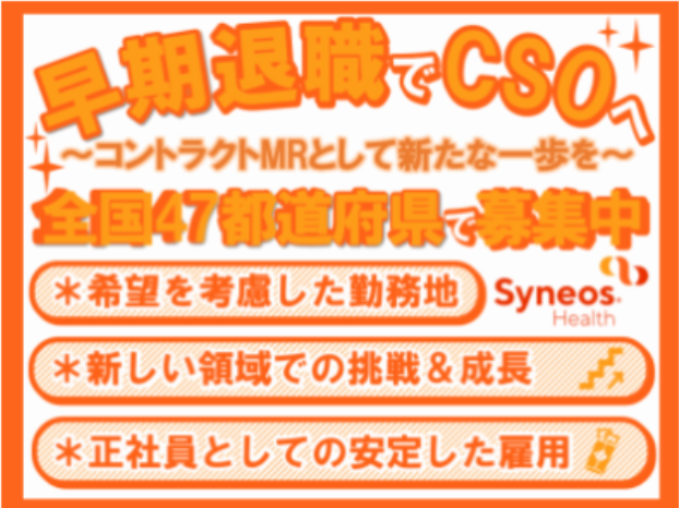 仕事内容 \無期雇用派遣の正社員募集/ ◇◆◇◆◇◆◇◆◇◆◇◆◇◆◇ 全国47都道府県で募集中! 希望の勤務地での活躍が可能です。 ご希望の勤務地やプロジェクトなど ぜひご相談ください! ◇◆◇◆◇◆◇◆◇◆◇◆◇◆◇ 手厚いサポートで「ずっと働きたい」が見つかる! サイネオス・ヘルス・ジャパンの魅力は、自他共に認める“手厚いサポート”です。 当社のマネージャーは全員がコントラクトMR経験者。 皆さんの気持ちを深く理解し、地に足の着いたサポートを実現しています。 例えば、「このエリアで働きたい」「オンコロジー領域に挑戦したい」といった希望を丁寧にヒアリングし、 可能な限り希望に沿ったプロジェクトへのアサインをサポート。 派遣先での困りごとや努力が見えづらい中でも、定期的な電話や面談で密にフォローし、その内容を基に正当な評価を行います。 もちろん、働き方やキャリアパスの相談にも親身に応じ、具体的なアドバイスを提供しています。 このように多角的なフォローを徹底しているからこそ、当社のサポート体制は高く評価され、 一度離れた方々からも「またサイネオスで働きたい」と再雇用の声が多数寄せられます。 ※実際に再雇用も積極的に行っています。 「いつまででも働き続けたい」と思える環境に興味をお持ちの方は、ぜひご応募ください! ―――――――― □■仕事内容■□ ―――――――― 医師・薬剤師への医薬情報提供や営業活動を行います。 全国各地に拠点があり、プロジェクトの内容も多種多様。 ご希望の勤務地、領域等なんでもご相談ください! *新薬、オンコロジー、バイオ製剤など、CSOだからこそ多種多様な内容のプロジェクトがあります。 <プロジェクト例(一部)> ・CNS(中枢神経系) ・自己免疫疾患 ・オンコロジー ・プライマリー ・呼吸器 ・ジェネリック ・糖尿病 など *スペシャリティ領域を中心に様々な内容のプロジェクトがあります。 まずはご応募いただき相談してください! 新薬、中枢神経領域、自己免疫疾患領域、オンコロジー領域、バイオ製剤、希少疾患領域、循環器領域、など挑戦できる製品群は幅広く 各プロジェクトの特性と社員の特性をフィットさせながら、高いパフォーマンスが発揮できるよう最適な配置を実現しています。 <充実の研修プログラム> 「スキル・キャリア・役職などに応じた数十種類のトレーニング」などをご用意。 経験者がより専門性の高い知識・スキルを身につけられるプログラムもございます。 教育制度で知識を積み、成長した上でオンコロジーや希少疾患といった専門性の高い領域にも挑戦可能です。 ――――――――――― □■働き方について■□ ――――――――――― ◎希望の勤務地で活躍が可能 47都道府県にプロジェクトあり、初任地はもちろんのこと、2ndプロジェクト以降も可能な限り希望の領域・エリア内で挑戦いただけるようサポートします。 人事はMR(CSO)経験者だからこそ、わかることが沢山あります。プロジェクトの内容や入社後のキャリアなど、何でも相談してください。 ◎柔軟な働き方 転勤なし・副業可能・育休、産休など働きやすい環境をご用意しています。(プロジェクトによる) ◎希望にあった働き方が可能 当社は新薬の開発から上市、医薬関係者への情報提供まで製薬企業であるお客様の要望にワンストップで対応できます。 そのため、ケイパビリティを豊富に持っており、変化の早い環境下でも社員一人一人がキャリアパスをしっかりと見据え、多様な経験が積めます。 ◎福利厚生や支援体制を整備 できる限り、安心して働いていただけるよう制度も充実させています。 プロジェクトの内容によって引越しが発生する場合は、入居先を探す費用や引越し自体の費用も会社負担で行っています。 ◎安定的な年収 長期就労の安心&安定した年収アップが可能です。