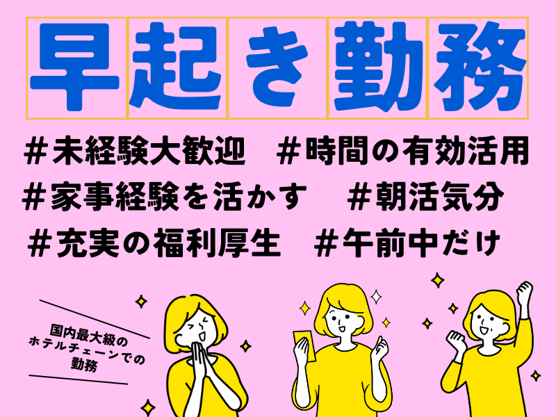 仕事内容 ✨朝活で健康も収入もゲット! 爽やかに1日をスタートしませんか?✨ 東横インホテルの 朝食準備のお仕事です。 朝食スタッフは、おにぎりやパン、お味噌汁などの準備、 片付けなど簡単なお仕事を担当します。 朝食会場や厨房の清掃、食材管理(発注・納品の確認)も行います。 火を使ったり、包丁を使うような調理は ありませんので安心して下さいね。 シンプルな作業ばかりなので、 調理に自信がない方でも始めやすいです。 家事スキルがあれば、未経験者も活躍できますよ。 ⭐未経験大歓迎! 調理・接客の経験がなくても構いません。 慣れるまで優しく丁寧にお教えしますね♪ お人柄を重視した採用を行っていますので 面接には履歴書不要です。 ブランクなどもお気になさらず、 お気軽にご応募くださいね。 ⭐シフトの融通が利く職場環境です。 プライベート、家事、お子さんの行事など あなたの都合に合わせて働いていただけます。 まずは無理のないシフトから 働いていただき、慣れてきたら 勤務日数を増やすのも大歓迎! 希望のシフトを聞かせてくださいね♪ \すぐに活躍できる環境◎/ 20代、30代の若手や 40代、50代、60代の中高年まで活躍中! 「家計の足しに」と働く主婦パートさんや 「自分のお小遣い稼ぎに」と働くシニアさんなど在籍中! スタッフ想いの支配人なので、 無理なく、家庭と両立して働けます! \東横INN博多駅バスターミナル前について/ ★最寄り駅から徒歩1・2分と駅近で通勤便利 ★福岡の玄関口、博多駅には朝早くから営業している飲食店が多い! 仕事終わりにがっつりブランチを楽しむのもよし、 優雅にモーニングを楽しむことも! また大型商業施設や百貨店が開店する時間に仕事が終わるので、 お店をぶらぶらすることも◎