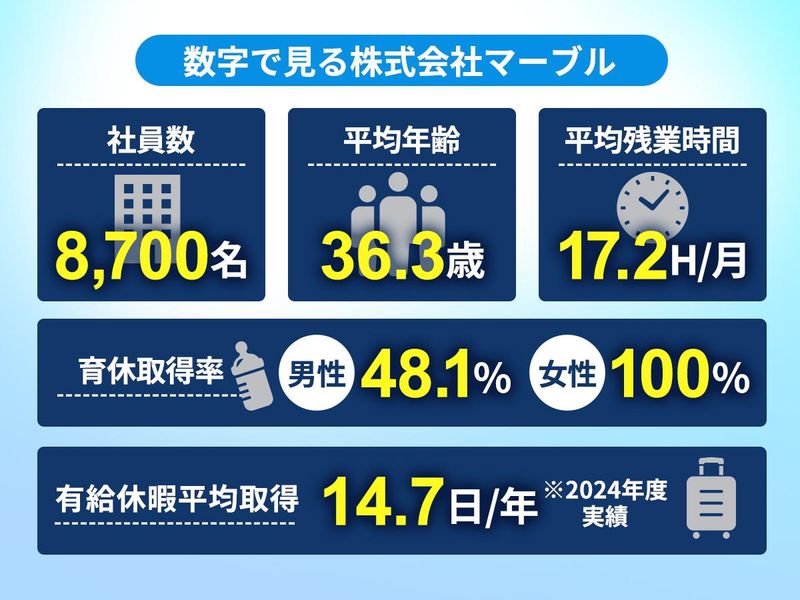 勤務地 ※転居を要する転勤はありません。 ※詳細は当社HPをご確認ください。 https://www.marble-corp.co.jp/company/branch.html 弊社も各地に事業所があり、 希望によって勤務地変更する事も可能! (例) ・旦那様の転勤に合わせて勤務地を変更したい ・地元に戻って親の介護をしながら働きたい ご不明な点があればお気軽にご相談ください!