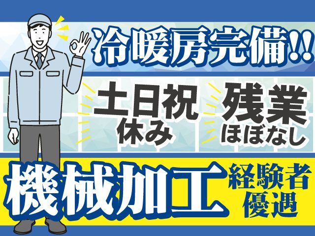 仕事内容 \ “働きやすさ重視”でお仕事探し! / 残業ほぼなし×長期休暇ありでプライベートも充実! 長期・安定の製造工場でのお仕事です。 金属加工の経験を活かして、 日勤×土日祝休みの好環境で働きませんか? NC・MC操作が中心の加工オペレーター募集! 《 お仕事内容 》 ・NC旋盤、マシニングセンター(MC)を使用した部品加工 ・材料(鋳物・アルミ類)のセット ・機械操作(プログラミング・機械加工) 30cm程度の取り扱いやすいサイズの部品で、 加工作業では、1人で複数台の機械を扱います。 \ Point!! / 少人数で風通しの良い職場! 一人ひとりが自分の作業に集中できる環境です◎ 作業場は冷暖房完備! いつでも快適環境で仕事に取り組めます! ▼ ココで働くメリット ・日勤&土日祝休み&残業ほぼなし ・夏季休暇などの長期連休もあり ・週払いOK!急な出費にも柔軟に対応! ・冷暖房完備で季節関係なく快適に働ける! ・20代~50代の男性スタッフ活躍中! ▼ こんな方におすすめ! ・製造機械加工の経験を活かしたい方 ・一つひとつの作業に集中したい方 ・チーム作業よりモクモク作業が好きな方 ・自分の時間や家族との時間も大切にしたい方 機械加工の経験がある方は積極採用中! 少人数だからこそ、新しい方にも丁寧に教えます。 職場見学も可能ですので、まずはお気軽にお問い合わせください!