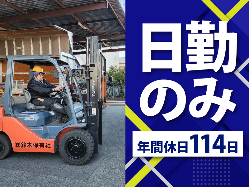仕事内容 \\フォーク実務経験があればOK (経験年数は不問)// ◤ ̄ ̄ ̄ ̄ ̄ ̄ ̄ ̄ ̄ ̄ ̄◥ お仕事のポイント 【1】太成倉庫内での勤務 【2】年間休日113日! 【3】車通勤OK! ◣___________◢ 安心安定の企業でのお仕事です! 腰を据えて働きたい方大歓迎! 少人数での作業です! <取扱商品> 1.鉄道車車両部品 2.エレベーター部品 3.その他重量物 ◥◣ お仕事詳細 ◥◣ 倉庫内での入出庫作業・在庫管理・ 仕分けを中心に、 フォークリフトを使用した 作業をお任せします! ◆入出庫作業 ◆在庫管理 ◆ピッキング ◆仕分け …等! <作業割合> ■フォーク作業 └約9割 ■手作業(ハンドフォーク・簡単な事務作業) └約1割 フォークリフトの実務経験者募集! 経験を活かして即活躍可能な業務内容です! <荷物の重さ> 100kg~1000kg ◥◣ 1日のスケジュール例 ◥◣ ■8:00~10:00 当日の入出庫作業(荷積み・荷下ろし) ■10:00~12:00 入庫品の保管整理・午後の出庫準備 ■12:00~13:00 昼休憩 ■13:00~15:00 午後の入出庫作業(荷積み・荷下ろし) ■15:00~17:00 入庫品の整理・翌日の準備作業 ◥◣ 勤務地について ◥◣ ◆所在地 東京都府中市西原町1-16-6 府中第一営業所 ◆アクセス 「北府中駅」バス15分 \スタッフの年齢は40代~50代が中心/ 働きやすい職場環境にあります!  ̄ ̄ ̄ ̄ ̄ ̄ ̄ ̄ ̄ ̄ ̄ ̄ ̄ ̄ ̄ ̄ ̄ ̄ ✤府中営業所では 日々の作業日程が予め決まっており、 1日あたりの作業量も 無理なく計画されているため 作業人員1人の作業負荷は無理のないもの となっています。 また、原則、荷主の休業日に合わせた休日 となっているため、 有給休暇の取得もスムーズです! =================== 【事業内容】 倉庫業、倉庫荷役、保管荷役、運搬荷役 ===================