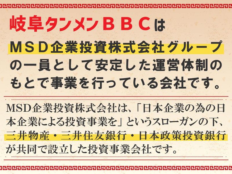求めている人材 ・学歴不問 ・資格不問 ・知識不問 ★飲食業未経験の方も大歓迎 <下記1つでも当てはまる方は大歓迎> ✅安定した働き方を求めている方 ✅仕事とプライベートの両立を図りたい方 ✅ラーメンが好き、興味がある方 ✅大きな目標を掲げる会社で働きたい方 ✅自分の成長が会社の成長に直結するような環境で働きたい方 ✅岐阜タンメンBBCの理念や考え方に共感してくださる方 <以下のような経験がある方は歓迎します> ✅ラーメン店での勤務経験者 ✅ラーメンに限らず飲食店での勤務経験者 ✅飲食店に限らず接客や販売サービス業などの経験者 <こんな不満を抱えている方へ> ✅仕事がマニュアル化されていて自由度がない ✅従業員や会社に成長意欲がなく、自分だけ浮いている ✅日々のルーチンワークばかりで、新店舗立ち上げなどわくわくする仕事がない
