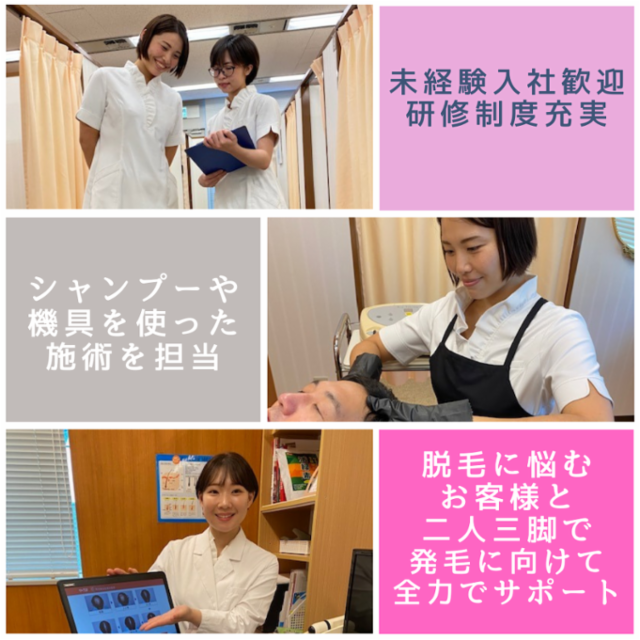 職種 施術スタッフ(発毛クリニック) 事業内容 頭髪の発毛施術サービス及び関連商品の販売 勤務地 リーブ21水戸O.C 採用予定人数 1~5名 休日休暇 完全週休2日制(月曜・火曜定休日) 年間休日114日 年末年始(12/30~1/4) 忌引 産休・育休実績多数 春休暇(2日)+公休 夏休暇(2日)+公休 バースデイ休暇 年1回最大10日間リフレッシュ休暇有 福利厚生 ・各種社会保険完備(入社日に加入) ・昇給(年1回)・賞与(年2回) ・交通費規定支給(月3万円まで) ・制服貸与 ・定期健康診断・結婚・出産祝金 ・社員割引制度 ・発毛用商品や、発毛ケアサービス等に社員割 ・高級リゾートホテル(エクシブ) ・表彰制度(年2回) ・結婚・出産祝金 年収例 1年目:年収260万円(発毛施術スタッフ) 2年目:年収280万円(発毛施術スタッフB) 3年目:年収300万円(発毛施術スタッフA) 5年目:年収400万円(チーフ) 応募・プロセス 1.応募 必須ではございませんが、すでにお手元に ご準備のある方は、履歴書、職務経歴書の 添付を推奨しております。 2.面接(1回) 土日・夜間・ZOOM面接も可。 (最終受付20:00スタート) 当社では「スキル・経験」よりも 「人柄」を最も重視しています。ほぼ全員が 未経験からスタートしていますのでご安心下さい♬ 適性検査を実施する場合もございます。 3.内定 転職時期が確定していなくても ご安心ください、入社時期も お気軽にご相談可能です。 応募前に要確認 ・施術時に、おすすめ商品の案内はありますが、個人での販売ノルマはないです。 ・ヘルプ・出張業務はありますが、持ち回り制ですので一人に負担がかからないよう配慮しております。 ・土日は出勤です(年間5日間の特別休暇は自由にお休みできます) 向いている方 ・今までの接客経験を活かして、お客様一人ひとりとじっくり向き合いたい ・「ありがとう」と言ってもらえる仕事にやりがいを感じる ・夜勤やシフト勤務から卒業し、安定した生活リズムを手に入れたい ・ワークライフバランスを大切にし、趣味やプライベートも楽しみたい ・評価制度が整った企業で、頑張りをしっかり認めてもらいたい ・ホワイト企業で安心して長く働きたい ・会社のビジョンに共感し、人の人生を変える仕事にやりがいを感じる
