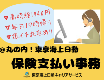 仕事の内容 \ブランクOK!研修あり安心スタート/ ◆高時給/時給1940円 ◆残業なし!毎日17時帰り○ ◆慣れたら週イチで<在宅ワーク> @丸の内仲通りビル 【基本情報】 雇用形態:派遣社員 雇用期間:長期(3カ月以上) 1月~開始日相談可能 就業時間:9:15~17:00(休憩60分) 【必須条件】 ◆自動車保険金支払いの事案のご担当の経験がある方 ◆パソコン:基本操作(入力~修正) 【お仕事内容】 お客様や関係各所への電話対応 ・修理工場へ入庫確認 ・レンタカーの期日管理 ・お支払い先確認 など ◆最初に3日間の導入研修あり!スムーズな職場デビューを応援 →保険の基礎知識やシステム操作確認してからスタート!専任の講師が対面でしっかり教えてくださいます! @丸の内仲通りビル! お洒落なカフェや飲食店が並ぶ丸の内仲通りエリアでのご勤務です♪ 【環境面等】 ・30代・40代・50代の多い職場 └幅広い年代活躍中/子育てに理解ある主婦(夫)が活躍中/TCS派遣スタッフさん大勢ご活躍中 └ご指示シッカリ!安心○チームワーク/わからないことは質問、確認をしながらオシゴトできる環境です ・在宅ワーク実施中(現在は週1日程度/PC貸与なし) ・オフィスカジュアル内で服装自由 【福利厚生等】 ・ランチタイムは休憩スペース利用OK └お弁当持参OKです/周辺にはコンビニや飲食店などが充実 ・ベネフィット・ステーション ・社会保険完備 ・定期健康診断あり ・禁煙オフィス!煙苦手な方も安心 ・平日のみOK!土日祝休み ・年間休日120日以上&お休み相談可 └有給休暇 ・大手ならではの環境で、収入も自分時間も大切にしてお仕事したい方にぴったりの職場です!ご応募お待ちしています! ○●嬉しいPOINTたくさん!●○ 履歴書不要!開始日相談/長期/駅チカ/駅歩5分以内/ブランクOK!研修あり/在宅OK/月収例25万円以上/社保完備/残業なし!毎日17時退社/7時間以内勤務@1940円