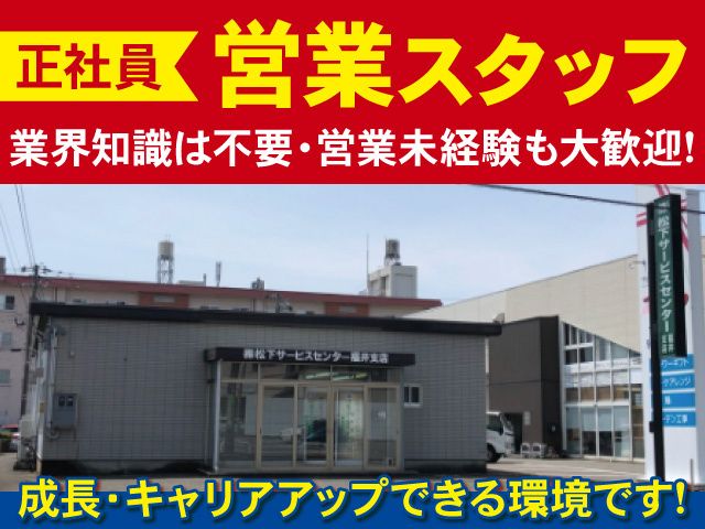 仕事内容 福井市米松にある 「(株)松下サービスセンター 福井支店」で 正社員の営業スタッフを募集中です。 【当社の強み】 YKK AP株式会社のアルミ外装材や新商品を 先行販売できるパートナー企業です。 商品の知名度・信頼度・品質が抜群なため、 お客様にも自信を持ってご提案できます。 営業のしやすさが違います! 〈ここがポイント〉 ━V━━━━━━━━━━━━━━ 年齢・性別・学歴・経験一切不問! これまでの経歴は問いません。 「これから頑張りたい」 「しっかり稼ぎたい」 その意欲を正当に評価します。 頑張りが収入に直結!高収入を実現 月給は306,000円からのスタート! さらに、あなたの頑張りや成果は 「業績給」や「特別報奨金(年4回)」で しっかりと給与に反映します。 <月収例> 入社1ヶ月でも、 月収50万円以上を実現している社員が多数! (月給306,000円+業績給) あなたの意欲次第で、 早期から高収入を目指せる環境です。 プライベートも大切にできます しっかり働き、しっかり休む。 オン、オフのメリハリを大切にしています。 ・週休2日制(会社カレンダーによる) ・GW休暇 ・夏季休暇 ・年末年始休暇など お休みもしっかり取得可能です ━━━━━━━━━━━━━━━━ 【主な業務内容】 ━━━V━━━━━━━━━━━━ YKK APの高品質なアルミ外装材 (外壁やカーポート、テラス、窓など)を お客様へご提案する営業です。 〇お客様への新商品のご提案 新商品の特徴や導入メリットのご説明 〇お見積りの作成 〇施工スケジュールの調整 など 入社後まずは、先輩社員との同行やOJT研修など 営業のノウハウを丁寧に教えますので 未経験の方も安心してご応募ください。 営業が初めての方、業界未経験の方も 安心してチャレンジしてください。 業界大手メーカーの信頼とブランド力が あなたの営業活動を強力に後押しします! 【応募について】 ━━━V━━━━━━━━━━━━ 営業経験者はもちろん、 未経験・異業種からの キャリアチェンジも大歓迎です! 「年齢を理由に転職を迷っている」 「未経験からでも高収入を目指したい」 そんな方もぜひ、一度ご相談ください。 中高年の方も多数活躍中です。 ご不明な点やご質問等ございましたら まずはお気軽にお問い合わせください。 面接は随時実施しております。 入社時期についてもお気軽にご相談ください。 TEL.0776-57-0888(担当/採用係) ※WEBからの応募は随時受付中です! (確認次第、ご連絡いたします) 年齢で転職をあきらめないでください。 中高年の方もOKです。 あなたからのご応募をお待ちしております。