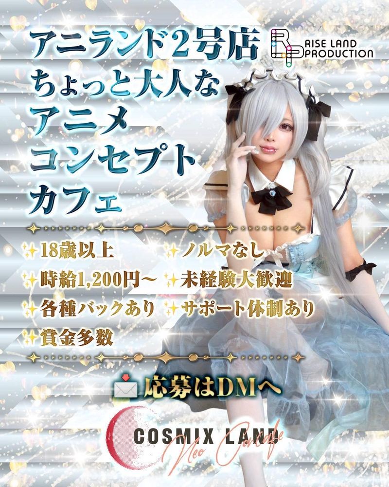 仕事内容 =⭐3月新店舗OPENN⭐= 落ち着いた大人の雰囲気の アニメコンセプトカフェ&BAR! ⭐店舗運営スタッフ大募集⭐ 【具体的には】 ・店舗運営における現場管理 ・キャストさんの管理 ・シフト作成 ・キャストさんの送迎 ・売上管理/在庫管理 ・イベント企画 ・SNS更新 世界観づくりから店舗運営まで 幅広く携われるポジションです。 ✅普通自動車OK ✅男性活躍中 ✅経験不問 ✅社用車あり 【当店について】 札幌すすきのに新店舗オープン! 当店は札幌で有名なコンカフェグループ 「RISE LAND PRODUCTION」 が運営する、 落ち着いた大人の雰囲気の、 コンセプトカフェ&BARです! 当店では、推しのアニメキャラの コスプレをして働けるなど、 ここでしか味わえない体験が満載で、 アニメ好きにはたまらない職場です! 私たちと一緒に楽しみながら働きませんか!