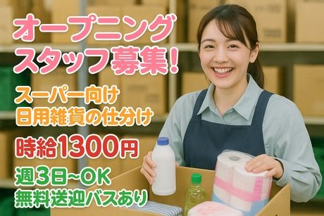 仕事内容 ◆スーパー向け日用雑貨の仕分け作業 <お仕事内容> スーパーに納品する、 日用雑貨(洗剤・スポンジ・ラップ・ティッシュ・文具・衛生用品など)を、 店舗ごとの注文票に沿って仕分けするお仕事です。 伝票やリストを見ながら必要な数をピッキングし、出荷準備をします。 重いものは少なめで、女性スタッフも活躍中♪ 未経験でもすぐ覚えられるカンタン作業です。 【おすすめポイント】 ・オープニング募集で一緒にスタート出来る仲間も多数♪ ・近鉄「新田辺」駅・JR「京田辺」駅から送迎バスあり ・週3日~OKでプライベートと両立 ・日曜固定休みで予定が立てやすい ・女性スタッフ活躍予定の職場