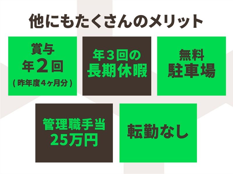 【保険制度】 雇用保険、労災保険、健康保険、厚生年金 福利厚生 ■社会保険完備 ■退職金制度(入社3年以上) ■社員研修旅行 ■海外研修旅行(7日間・10万円の支度金付き)※優秀社員選抜 ■優秀社員選抜社内食事会 ■永年勤続表彰 ■報奨金制度 ■制服・社用携帯貸与 ■結婚・出生祝い金・弔慰金 ■社員割引制度 ■クラブ活動補助制度 ■各種保険加入制度 ■社員無料駐車場あり ■社内公募制度 ■各種研修制度・講習制度