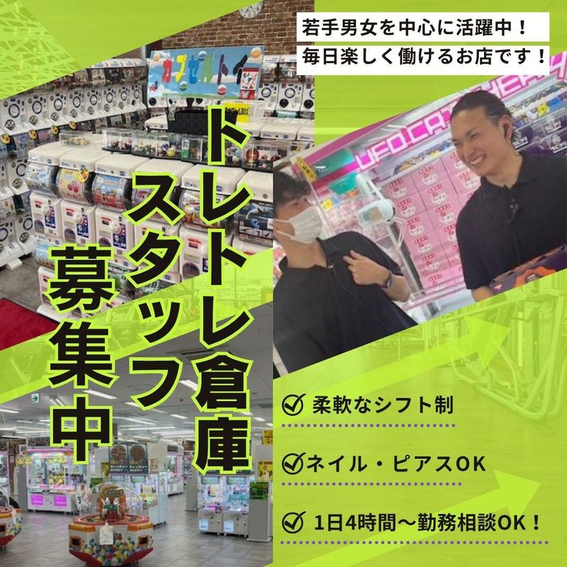 仕事内容 ★*・*★*・*★*・*★*・*★ 初バイトの方も未経験の方も大歓迎! ”トレトレ倉庫 豆津バイパス店”で 楽しくアルバイトを始めよう✨ 充実待遇で働きやすさも抜群です! お気軽にご応募ください♪ ★*・*★*・*★*・*★*・*★ << お仕事内容 >> ✅レジ業務 ✅品出し ✅景品交換 など。 ●研修制度も充実しているので、 販売・接客が未経験の⽅でも安⼼です。 研修を通して徐々に業務になれていってもらえればOKです。 ●分からないことや困ったことは気軽に聞いてください。 先輩がすぐにサポートします︕ \✨トレトレ倉庫 ⾖津バイパス店✨/  ̄ ̄ ̄ ̄ ̄ ̄ ̄ ̄ ̄ ̄ ̄ ̄ ̄ ̄ ̄ ̄ ̄ ̄ ̄ 当店ではクレーンゲームなどのアミューズメントの他、 おもちゃの買取りやトレーディングカード⼤会など、 さまざまなイベントも⾏っています︕ 働きながら掘り出し物なども⾒つかるかもしれませんよ︕ ⾊んなものに囲まれながら楽しく働ける職場です。 \✨注⽬のメリット✨/  ̄ ̄ ̄ ̄ ̄ ̄ ̄ ̄ ̄ ̄ ̄ ̄ ⏩シフトの柔軟性抜群︕ 週1⽇〜でも勤務OKです。 ⾃分のライフスタイルに合せて働けるのも魅⼒です。 学業・家事のも両⽴もできちゃいます︕ ⏩オシャレもOK︕ 髪⾊・髪型⾃由︕派⼿過ぎなければ、 ピアス・ネイルもOKです︕ オシャレも楽しみながら⾃分らしく働けます。