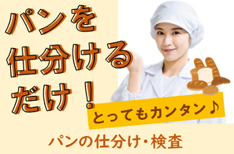 仕事内容 働きやすい◎14時30分からのスタート◎日中の時間も活かせる!コンビニやスーパーでよく見る、あのパンを仕分けるお仕事♪工場で作ったパンを格安で購入できちゃう(*^-^*)パン好きにはたまらん! <仕事内容> コンビニ向け・スーパー向けの菓子パン、お惣菜パンや食パンを仕分けるだけのお仕事! 袋に入った状態のパンを、見て仕分けるだけなので、とってもカンタン! 足元にある、個数を知らせるランプで教えてもらえます。 初心者さんでもカンタンに覚えられます!! 立ち作業です。 グループ作業になります。 《職場環境》 男女共に活躍中の職場です。 ロッカー有り|休憩室完備 アピールポイント <仕事内容> コンビニ向け・スーパー向けの菓子パン、お惣菜パンや食パンを仕分けるだけのお仕事! 袋に入った状態のパンを、見て仕分けるだけなので、とってもカンタン! 足元にある、個数を知らせるランプで教えてもらえます。 初心者さんでもカンタンに覚えられます!! 立ち作業です。 グループ作業になります。 《職場環境》 男女共に活躍中の職場です。 ロッカー有り|休憩室完備 \充実した福利厚生/ ◎社会保険・雇用保険完備 ◎有給休暇有(6ヶ月経過後、10日付与)※規定あり ◎残業手当 ◎交通費支給(規定内) ◎確定拠出年金制度 ◎週払い制度(週3回対応) ◎お友達推薦制度あり(規定有り) ※1名につき3万円~10万円臨時給与として支給 ◎職場見学あり ◎車(マイカー)・バイク通勤可(無料駐車場あり) ◎ロッカー・休憩室利用可 ◎社員食堂あり(1食270円) ◎食事持参可 ◎福利厚生プログラム (宿泊、グルメ、ショッピングなど大幅割引が受けられる10万アイテムのメニューがあります。)