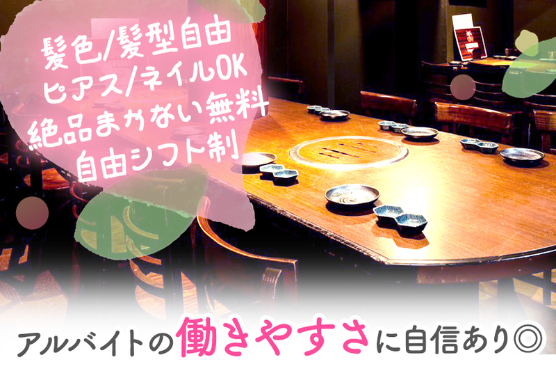 【保険制度】 雇用保険、労災保険、健康保険、厚生年金 待遇・福利厚生 【福利厚生】 ■絶品まかない無料! →希望を聞いて、 料理長が絶品まかないを作ります! ■髪型・髪色自由! ■ピアス・ネイル・ひげOK◎ ■交通費支給あり ■制服貸与 ■自由シフト制! ■昇給あり↑ ■WワークOK◎ ■社員登用あり ■即日勤務開始OK◎ ■スタッフ割引あり