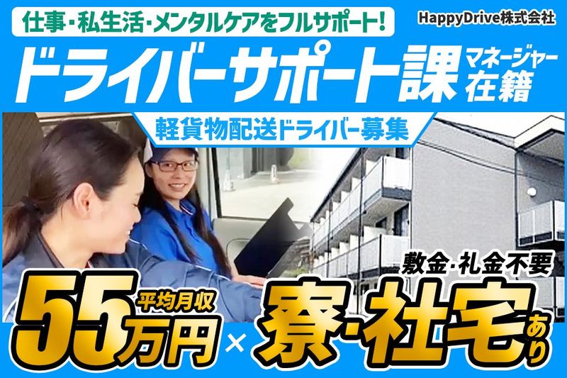 PR・職場情報 ドライバーさんが働きやすい環境づくりを心掛けており、 仕事や私生活までフルサポートするドライバーサポート課を設けております。 「今月はたくさん稼ぎたい」「自由に休みたい」「安定的に稼ぎたい」等 自分のライフスタイルに合わせて働くことが出来ます。 将来的に独立を考えられている方もしっかりサポートいたしますので、 ぜひご応募ください。 求人の特徴 【応募~契約までの流れ】 (1)応募(電話とショートメッセージでご連絡します) (2)面接(オンライン可) (3)ご契約、勤務開始! 履歴書は不要、WEB面接も実施中! 最短で即日勤務も可能です。 ハローワークでお仕事を探されている方や未経験の方などお気軽にお問合せください!! 【当社独自のHAPPY育成プログラム】 4000社以上が導入している「識学」の考えを元に、 「育成プログラム」と「評価制度」を構築! 当社独自の研修資格を持った優良ドライバーがサポートし、 未経験の方でも安心して働くことが出来る環境づくりを行っています。 また、あなたの頑張り次第で収入が上がる評価制度を実施しており、 別の企業で配送がうまくいかなかった方や、運送業未経験の方でも問題ありません! 効率よく誰もが稼げるコツをお伝えします。 求人ポイント 社員登用あり,昇給あり,高収入・高月給,即日勤務OK,急募,昇格あり,フリーター歓迎,大量募集,学歴不問,未経験者歓迎,経験者歓迎,週払いOK,リモート面接OK,ブランクOK,履歴書不要,友達と応募OK,寮・社宅あり,独立支援あり