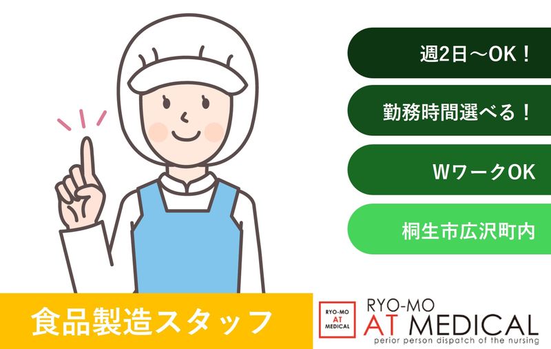 仕事内容 【週2日~OK】【時間自由】【時給1,250円】 食品製造スタッフ(パート・アルバイト)新規募集 <勤務地> 群馬県桐生市広沢町「食品製造工場」 *マイカー通勤OK(駐車場完備) *職場見学OK <仕事内容> 桐生工場内にて、食品の製造補助業務をお願いします。 ・半自動の機械有!力仕事は機械にお任せ ・生地、具材の投入 ・調理 ・完成品を容器に移す など かんたん冷凍食品の製造補助 *難しい作業はありません *未経験スタートのスタッフ多数! *コツコツ作業が得意な方にぴったりです <ポイント> ・短期集中でしっかり稼げる! ・自分のペースで働ける柔軟シフト ・未経験でも安心のシンプル軽作業 ・家庭やWワークと両立可能 <雇用形態・期間> 派遣社員(即日~) *勤務開始日は相談に応じます 【検索用キーワード】 食品製造/軽作業/未経験OK/週2日/短時間/WワークOK/フリーター/高時給/桐生市