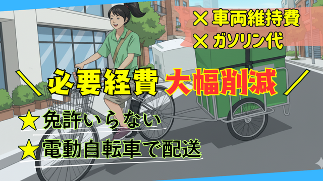 仕事内容 企業向けのコピー用紙や文房具などの事務用品を 電動アシスト自転車で配送するお仕事です。 配送エリアは新宿区や渋谷区オフィスが中心、担当配送エリアは営業所周辺が中心なので、移動範囲狭め! 免許不要で始められます◎ ※営業所迄の交通費は自己負担になります <具体的な仕事内容> ・センターで荷物の持ち出し・積込 └袋詰めの付帯業務があります ・企業やオフィスビルへの配送・集荷 ・配送件数:1日100〜120件程度(狭い範囲で効率的) ・専用端末を使用した配送管理 ・一部代引き対応あり(釣銭準備必要) ・制服(ポロシャツ)貸与、下は黒いパンツでOK <仕事のポイント> ・自分のペースで働ける ・免許不要!電動自転車だから未経験から始めやすい ・移動範囲は新宿区や渋谷区の営業所周辺、体力的な負担も軽減 ・車両維持費・ガソリン代など経費がかからない ・継続勤務や紹介で報酬アップ制度あり 【一日の流れ(例)】 <イメージ> 7:00 センターへ出勤、荷物の持出と積込み作業 9:00 配達開始 14:00 休憩 15:00 (2便ある場合は)積込み・午後配送 19:30 業務終了、片付け後退勤 ※本人の技量で早く終われる ※遅くとも20時頃までには終わります 【休日・休暇】 就業営業所による(※応相談可) 土日祝にお休みする方が多いです 【福利厚生・待遇】 ★業界最速級! 月末締め、翌25日支払 ★前払い制度(条件有) ★半年継続勤務で手当10万円支給(対象案件) ★勤続手当あり(1年・5年・10年で合計18万円支給) ★ドライバー紹介制度(10万円支給) ★社会保険労務士在籍、相談料無料!