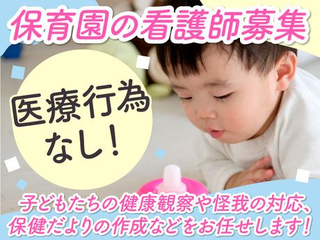 資格 必須資格: 正看護師または准看護師資格 経験不問 ブランクOK! 看護師としての経験が浅くても大丈夫! もちろん、経験のある方、 ベテランさんも即戦力として ご活躍いただけます! 主婦・主夫の方、 子育て世代の方も多数活躍中! 正看護師や准看護師の資格を 活かして働きませんか。 看護未経験でもブランクがあってもOK! 新卒・第二新卒やフリーターの方も お気軽にご連絡ください! 子ども好きな方、 子どもに関わる仕事につきたい方、 ぜひ一緒に働きませんか。 クリニック、 介護施設などでの看護経験はもちろん、 幼稚園や保育所、 認定こども園などでの経験も活かせます。 20代、30代の若手、 40代、50代の中高年・ミドルまで、 幅広い年代のスタッフが活躍中です。