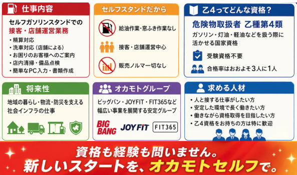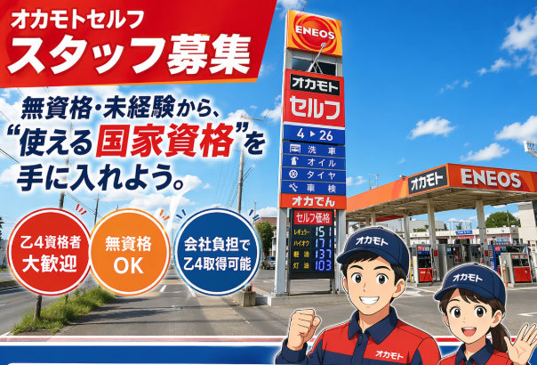 仕事内容 ━━━━━━━━━━━━━━ 無資格・未経験から “使える国家資格” を 手に入れよう。 ━━━━━━━━━━━━━━ セルフガソリンスタンドでの 接客および店舗運営業務をお任せします。 将来的に正社員としてのキャリアアップを目指したい方にも、 安心してスタートしていただける環境です。 まずは契約社員として安定した収入を得ながら、 接客や店舗運営のスキル、資格取得などを通じて 着実にステップアップしていくことが可能です。 仕事とプライベートの両立を大切にしながら成長し、 お客様へより良いサービスを提供できる。 その積み重ねが、自分自身のやりがいや将来のキャリアにも つながっていく―― そんな働き方をイメージしていただける職場です。 ━━━━━━━━━━━━━━ 「安定した会社で働きたい」 「人と関わる仕事がしたい」 「せっかくなら、将来にも活きる資格を取りたい」 そんな方にぴったりのお仕事です。 セルフスタンドのため、 給油作業や窓ふき作業はありません。 その分、お客様対応や 店舗運営を中心に取り組める環境です。 体力的な負担が 一部の作業に偏りにくく、 未経験の方も仕事を 覚えていきやすいのが特徴。 さらに、販売ノルマも一切ありません。 【 仕 事 内 容 】 セルフガソリンスタンドにて 店舗運営に関わる業務を 担当していただきます。 具体的には… ✅ 精算対応 ✅ 洗車対応(※店舗による) ✅ お困りのお客様へのご案内・接客対応 ✅ 店内清掃や備品点検などの施設管理業務 ✅ 簡単なPC入力・書類作成 (Word・Excelの基本操作ができればOK) 快適な店舗環境を維持するため、 空調管理や清掃、設備チェックなども行います。 「もっと使いやすくできそう」 「こうしたらお客様が安心して利用できそう」 そんな改善提案も大歓迎です◎ 【 乙4ってどんな資格? 】 乙4とは、 危険物取扱者乙種第4類のこと。 ガソリン・灯油・軽油などの 第4類危険物(引火性液体)を 取り扱う際に活かせる国家資格です。 また、乙種は受験資格が不要なので、 未経験の方でもチャレンジしやすい資格です。 【 資格がなくても応募OK 】 今回は乙4必須ではありません。 入社後に、 会社負担で乙4資格の 取得を目指せる環境があります。 「資格がないから不安…」 「まずは働きながら覚えたい」 という方でも大丈夫。 仕事を覚えながら、国家資格まで手に入れられる。 そんなステップアップができる職場です。 【 難易度はどれくらい? 】 乙4は、 誰でも受験できる国家資格ですが、 簡単すぎる資格ではありません。 消防試験研究センターの試験実施状況では、 乙種第4類の合格率は令和7年度31.6%。 おおよそ3人に1人前後が合格している水準です。 しっかり対策すれば十分に目指せる、 現実的な国家資格といえます。 【この仕事の将来性】 国内ではガソリン需要の減少や 人手不足などの課題がある一方で、 サービスステーションは今もなお、 地域の燃料供給を支える重要 かつ不可欠な社会インフラとされています。 資源エネルギー庁も、 SSを国民生活や"経済活動を支える拠点"と 位置づけています。 つまりこの仕事は、 ただ燃料を扱う仕事ではなく、 地域の暮らし・物流・防災を支える仕事です。 【 嬉しい社割が充実 】 オカモトグループ各店舗で、 さまざまな割引制度が利用できます。 ✅ ガソリン・灯油 ✅ カーメンテナンス ✅ お食事代 ✅ フィットネスジム など ご本人はもちろん ご家族もお得に利用可能です◎ 【会社について】 オカモトグループは、 ・グループ21社 ・直営695店舗 ・FC162店舗 ・従業員5,655人 合計売上高1,905億円(2025年3月期) を誇る企業グループです。 ガソリンスタンド事業だけでなく、 なんでもリサイクルビッグバン などのリユース事業、 JOYFITやFIT365などのフィットネス事業も展開。 その他にも、ホームエネルギー、 自動車整備、外食、介護など、 幅広い分野で事業を行っています。 “ガソリンスタンドの会社”にとどまらない、 安定した事業基盤が魅力です。 【担当者より】 当店では、 お客様に快適なカーライフを提供できるよう、 スタッフ一同、丁寧な対応を心がけています。 今回は、資格も経験も問いません。 大切なのは、 「やってみたい」 「人と関わる仕事がしたい」 「安定した環境で成長したい」 という気持ちです。 入社後は、 仕事を覚えながら会社負担で 乙4取得も目指せます。 無資格から始めて、 将来に活きる国家資格を手に入れる。 そんな新しい人生を、 オカモトセルフで切りませんか?
