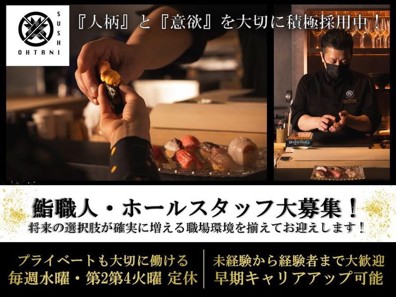 【保険制度】 雇用保険、労災保険、健康保険、厚生年金 待遇・福利厚生 【福利厚生】 ・まかない無料 ・従業員イベント充実 (月1回社員食事会、月1回サウナ会、社員旅行など) ・独立支援 ・制服支給 ・社割制度 ・教育制度 【早期スキル・キャリアアップ可能!】 職人として確かな実績を持つ店主大谷が直接指導する事で、大手チェーン店等と比べ、職人として格段に速く技術を学べます。 また、完全予約制の高級鮨店における接客サービスを学ぶ事でワンランク上のサービス力を身に付けられます。 さらに、新規出店、新業態開発が超加速中です! コース主体の赤坂鮨大谷はもちろん、江戸前寿司、立ち食い寿司、寿司居酒屋など、今後様々なお店を展開していきます。 職人としても、ホールスタッフとしても、より責任のあるポジションにつける可能性が大いにあります! 女性ホールマネージャーや本部広報兼任の新婚女性など性別や年齢に関わらず活躍しており、多様な働き方を尊重している企業です! 【独立支援が手厚い!】 将来独立を考えている方にもピッタリ。 当社で店舗経営のノウハウやマネジメントを学び、独立する際には不動産選びや業者紹介などもしっかりとサポートします!
