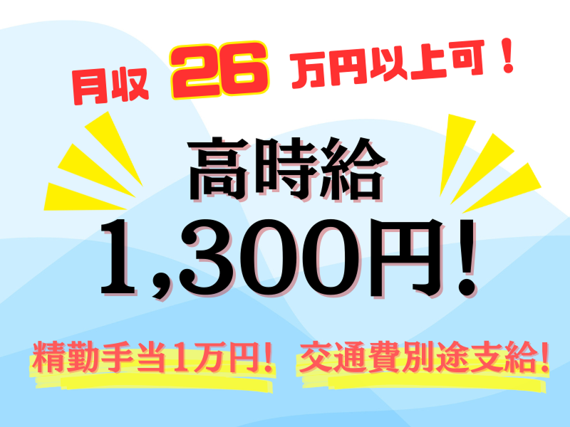 時給1,300円以上 給与: 26万8953円程度 (1,300円×7.67h×月21日+深夜手当+残業20h/月+精勤手当1万円の場合)