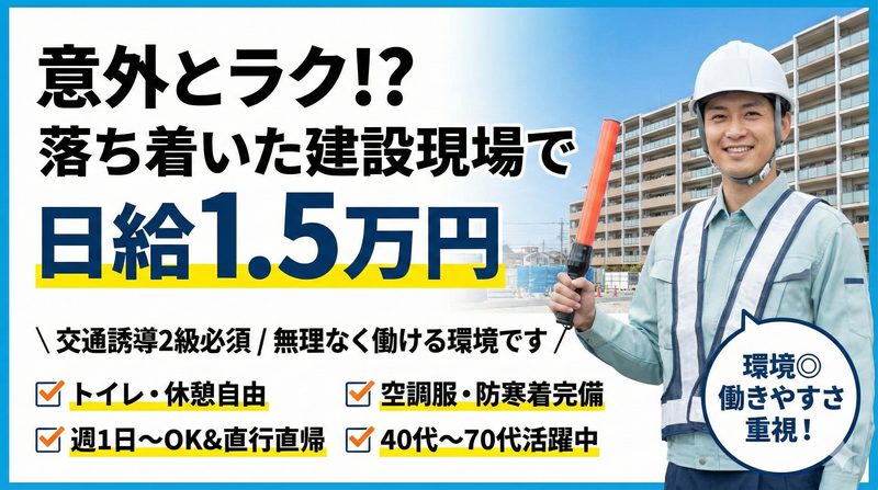 仕事内容 ▼ポイント ✅ 土日中心・週2日勤務が基本の交通誘導ワーク ※予定や体調により、週1日となる週も相談可能 ✅ 日給15,000円の高収入(有資格者) 資格を活かして、効率よく安定した収入を目指せます。 ✅ 作業はシンプルで未経験でも安心 誘導や声かけが中心。40代〜70代まで幅広く活躍中。 ✅ 直行直帰OKで通勤の負担少なめ 生活リズムを崩さず、無理なく続けられます。 ✅ シフト相談がしやすく、私生活と両立◎ 家庭・趣味・体調に合わせた調整が可能です。 ▼仕事内容 マンション建築に伴う交通誘導業務をお任せします。 工事車両の出入り時のご案内や、歩行者の安全確保など、 周囲の状況を見ながら行うシンプルな業務が中心です。 特別な資格や経験は不要。 事前に基本的な流れをお伝えするため、 未経験の方も安心してスタートできます。 ▼この仕事の魅力 このお仕事は、週2日を軸に無理なく続けられる働き方。 毎週同じ日数に縛られることはなく、 予定や体調に応じて勤務日数の相談がしやすい環境です。 「基本は週2日」 「今週は1日にしたい」 といった調整も、状況に応じて可能です。 ▼こんな方に向いています ・週末の時間を活かして収入をプラスしたい ・体を動かしながら健康的に働きたい ・家庭や趣味の時間も大切にしたい ・無理のないペースで長く働きたい 年齢や経験を問わず、自分のペースを大切にできます。 ▼勤務時間例 土日中心/8:00〜17:00(休憩あり) ※勤務日数・シフトは状況に応じて相談可能 ▼勤務エリア 横浜市旭区周辺エリアでの交通誘導業務です。 相鉄線沿線から通いやすい現場が中心。 直行直帰OKのため、週末勤務でも負担なく通えます。