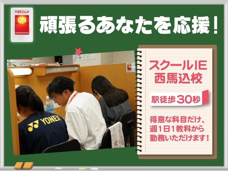 仕事内容 ✨研究・授業で忙しすぎる理系学生必見✨ 「無理ないペースで活躍できる」 「同年代の頑張る仲間ができる」 そんなバイトを探している方におススメです。 ー 忙しい理系学生や教職履修の学生も活躍中。 その理由は.... / ①スキマ時間で、自分のペースで働ける ②頑張る人を応援する風土がある ③西馬込駅徒歩30秒+自転車通勤OK \ 詳細は↓↓↓ ー ≪仕事内容≫ 小・中・高校生に対して テキストをもとに授業、採点、解説を お願いしています。 (メインは小中学生です) スクールIEのわかりやすいテキストに 沿った授業だから 大変な授業準備の必要がないし 授業中も困りません! 担当の科目や生徒の学年は 事前に希望を聞き、 希望に沿って決めるので 安心してくださいね! ≪働き方について≫ 授業が忙しいので普段は週1日 講習期間にがっつり稼ぐ!なども可能。 働き方については、ぜひ面接時に ご相談ください! ≪こんな方にピッタリ!≫ ★効率よく働きたい! ★一度きりの大学生活、全部頑張りたい! ★経験を積めるバイトがしたい! ===スクールIE 西馬込校の特徴=== ①シフトは【週1コマ:90分】~OK! ②西馬込駅から徒歩30秒!自転車通勤も可 通学の合間に働ける! ③講師同士の交流が活発で仲がいい ④生徒と講師のコミュニケーションも多く 近隣で一番雰囲気がいいと評判の校舎! ⑤得意な【科目】【指導レベル・学年】 を選べるから安心! ⑥華美すぎなければ茶髪・ネイル・ピアスOK ==スクールIE西馬込校のココが好き!== ≪Aさん≫ 生徒たちが人懐っこくてかわいい! ・・・・・・・・・・・・・・・・ 最近の子達と話合うかな...と不安でしたが おしゃべり好きな人懐っこい生徒が多く 授業前後にお話したりと 生徒と会うのが毎回楽しみです! ー ≪Bさん≫ 一緒に働く講師が好き!! ・・・・・・・・・・・・・・・・ みんな話しやすく、 生徒の話はもちろん、推しの話から 就活の話、まじめな話まで何でもしてます。 よくみんなで飲みに行くのですが 時に人生相談会になったり(笑) 立地が良くていろんな大学出身の人が 集まるから、人脈も広がります! ー ≪Cさん≫ 身だしなみの自由度の高さが好き!!! ・・・・・・・・・・・・・・・・ 塾長は講師みんなを応援しているから、 身だしなみに関しては、派手すぎなければ 【ネイルOK!】【茶髪・ピアスOK!】 置きスーツができるので きれいめ服+手ぶらで出社できます! 週1コマから働けるから、 飲食店や居酒屋、カフェと掛け持ちで Wワークもできますよ! ー ≪Dさん≫ 多忙な予定に合わせて働ける環境が好き! ・・・・・・・・・・・・・・・・ 毎学期はじめ/講習期間前に、 塾長が親身にシフト相談にのってくれるから 授業やサークル、実習が忙しかったり 海外に行ったり、忙しい生活を送りながらも 塾講師として働けています! ==さらに!働きやすいポイント== 実は、塾は運営する会社によって 働きやすさが変わりますが、 【スクールIE西馬込校】は 従業員調査の結果から「働きたい企業」に 選ばれた会社が運営を担当。 学生スタッフの定着率が高く、 「ここでバイトしてよかった」と 言ってくれる人が多い教室です。 ===最後に室長からメッセージ=== 学校の先生のような 完璧な授業をしようと考えなくても 大丈夫です! みんなで助け合いながら、 一緒に楽しく働けたら嬉しいです。 ご応募お待ちしています! ※こちらは理系科目メインの募集ですが、 もちろんそれ以外の科目の担当も可能! 学年や科目の相談は 面接時にお気軽にしてくださいね。