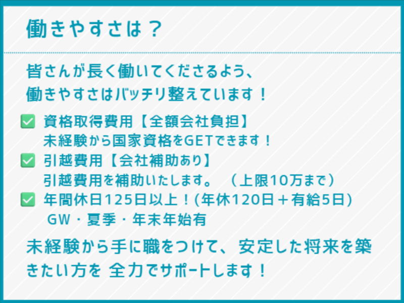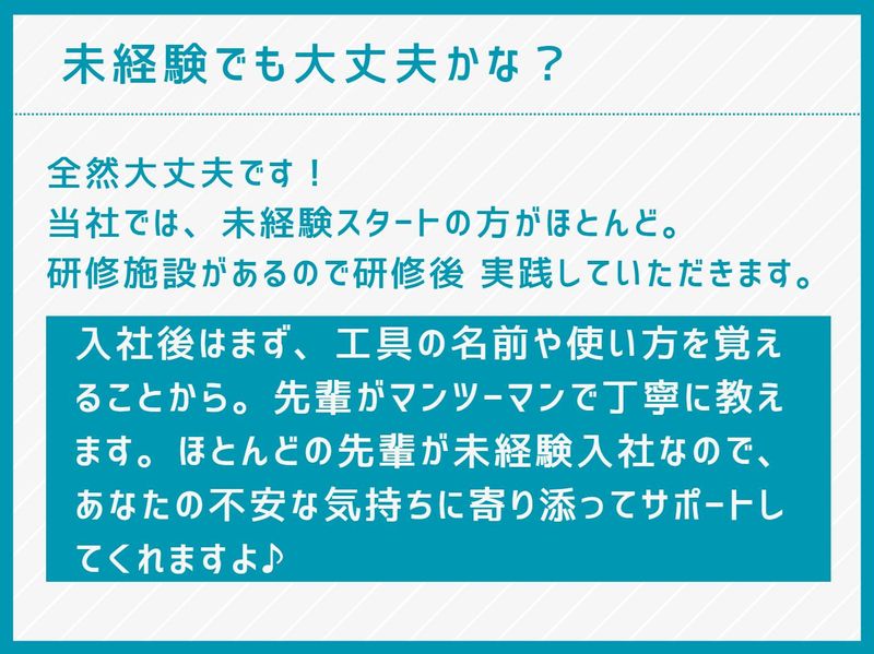仕事内容 ******アピールポイント****** ✨工事抑制期間による大型連休 ✨昨年度実績5.5ヶ月分の賞与 ✨実質年間休日125日の実現 ✨資格取得費用は全額会社負担 ******************** ┏━━━━━━━━━━━━━━━━━┓ 稼げる現場は休みがない。 そんな常識を疑いませんか? ┗━━━━━━━━━━━━━━━━━┛ 高い賞与と、10連休も可能な 休日制度を両立できるのは 公共インフラに特化しているからです。 今の生活水準を守りながら 家族との時間を大切にしたい方へ。 具体的なお仕事  ̄ ̄ ̄ ̄ ̄ ̄ ̄ ̄ ̄ ̄ ̄ ̄ ̄ ̄ ⚫︎信号機の新規設置と配線作業 ⚫︎老朽化した信号機や電球の交換 ⚫︎信号柱を建てるための掘削作業 ⚫︎地中ケーブルの埋設と接続作業 ⚫︎チームでの安全確認と交通誘導 信号機の点灯を守ることで 街の交通事故を未然に防ぎ 10年後の安全を作る仕事をお任せします。 1日の流れ(例)  ̄ ̄ ̄ ̄ ̄ ̄ ̄ ̄ ̄ ̄ ̄ ̄ ̄ ̄ 現場の場所により 社用車での移動が発生します 〈午前〉 ⚫︎ 08:00|出社・チームで現場移動 (3名1組の体制で現場へ向かいます) 〈午後〉 ⚫︎ 13:00|信号機の設置・点検作業 (1日1から2現場を丁寧に施工します) ⚫︎ 17:30|翌日の準備を終えて退社 (残業は月平均20時間以内です) 全ての現場が3名体制のため、 一人で判断を迫られる場面は 一切ありません。 ✅キャリアについて 電気工事士や施工管理技士など 一生モノの国家資格を取得し 信号機という特殊技術のプロへ。 景気に左右されない公共インフラの スペシャリストとして、生涯 安定した収入を手にできます。 ✅求める人物像 ⚫︎安全ルールを何より優先する ⚫︎仲間との声掛けを欠かさない ⚫︎技術を素直に吸収しようとする ✅この仕事に向いている人 ⚫︎手順通りの作業が得意な人 ⚫︎目に見える成果を確認したい人 ⚫︎長期連休でしっかり休みたい人 ┏━━━━━━━━━━━━━━━━━┓ 3名1組のチーム体制が、 あなたの未経験をプロの技術に変えます ┗━━━━━━━━━━━━━━━━━┛ 信号機の工事は全ての工程に 詳細なマニュアルが存在します。 まずは先輩の隣で道具を渡す 簡単な補助から始めてください。 道路工事の抑制期間があるため GWやお盆には10連休も可能です。 規律を大切にできる方なら 無理なく技術を習得できます。 「株式会社アイセイ電設」について  ̄ ̄ ̄ ̄ ̄ ̄ ̄ ̄ ̄ ̄ ̄ ̄ ̄ ̄ 警察や自治体から直接依頼を受ける 公共インフラ事業です。 競合が少なく安定した受注が 継続しているため、 昨年度実績5.5ヶ月分という 高い賞与還元が可能です。 また、行政が定める道路工事の 抑制期間に合わせて長期休暇を 設定しており、構造的に 「休める環境」を実現しています。