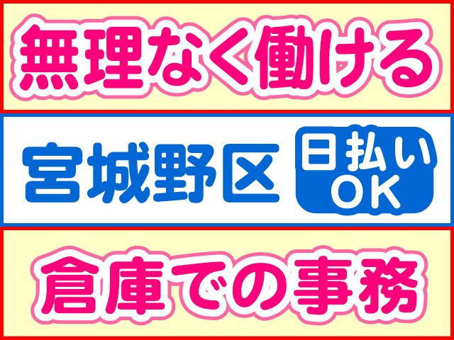 仕事内容 キレイな物流倉庫で、 落ち着いて働ける事務のポジションです! 【物流事務スタッフのポイント】 〇エクセルの基本操作ができればOK 〇土日祝休み 〇日勤固定 〇高時給1,220円 〇ブランクのある方もOK 〇仙石線「苦竹駅」から歩いて通える便利な立地 〇20代30代40代前半の男女活躍中 〇日払いOK(規定内) 〇職場見学OK 〇履歴書不要 【物流事務スタッフの仕事内容】 生活用品を扱う倉庫内オフィスでのお仕事です ー お仕事内容 ー ・データ入力 ・伝票発行 ・電話・来客対応 など 難しい作業はありません◎ 決まったフォーマットへの入力が中心なので、 Excelの基本操作ができればOK 少しずつ覚えていけるので、 「ブランクがあるけどもう一度事務がしたい」 という方にもピッタリです 商品も業務もイメージしやすく安心 【経験活かせます!】 〇電話応対 パート・アルバイト 〇PC入力 パート・アルバイト 〇コールセンター 派遣社員 〇問合せ対応 パート・アルバイト 〇一般事務 パート・アルバイト 〇オフィススタッフ パート・アルバイト 〇主婦・主夫 パート・アルバイト ブランクある方もOKです! コールセンター業務や一般事務などの 経験を活かして働けます! コーディネーター・定着支援のWサポート体制導入 「マイリク定着支援」導入企業! アンケートで職場の様子を確認し、 コーディネーター・定着支援担当が連携してサポート。 はじめての派遣でも安心して働けるよう迅速かつ 丁寧にサポート対応いたします。 ご不明な点はお気軽にお問い合わせください。 お電話でのご応募、ご質問も受付中! 株式会社ロフティー 仙台支店 担当営業、または採用担当まで TEL0800-222-6888(フリーダイヤル) 求人情報はコチラ https://entori.jp/lofty-sendai