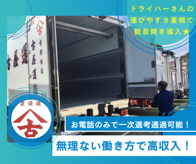 仕事内容 \週4日~OK!4tルート配送ドライバー募集/ \\フルタイムで走れる方大歓迎です!// ✨経験者歓迎!土地勘が活かせる神奈川県内配送✨ ✅アピールポイント ルート配送:固定ルートで安心!道に詳しくなれる楽しさも◎ 経験者歓迎:中型トラックの経験を活かせる! 丁寧な指導:自社スタッフがピッキングも担当!丁寧に運ぶコツを伝授! 勤務日数相談OK:週4日~5日のフルタイム大歓迎! ✅仕事内容 4tトラックでのルート配送 生鮮食品やパック済み商品をメインに配送 横須賀市や金沢区の市場から神奈川県内の スーパーへ配送をお願いします! ✅こんな方にオススメ 中型トラックの運転経験がある方 運転が好きで、土地勘を活かしたい方 安定したルート配送で働きたい方 ✅お客様からもお墨付き! 丁寧な配送でお客様からの信頼も厚い当社で、一緒に働きませんか? <こちらの求人は下記キーワードで検索されています> トラック運転手、アルバイト、ドライバー 運転手、ドライバー ルート配送、正社員 アルバイト・パート、中高年、運転手大型、 4t ドライバー、w ワークも ok、ダブルワークok、 フルタイム、中型トラックドライバー、単発、 古屋運送、大型長距離、有限会社古屋運送 横須賀市 ドライバー、横須賀市 ドライバー 正社員 運送、配送、配送 配達、配送ドライバー