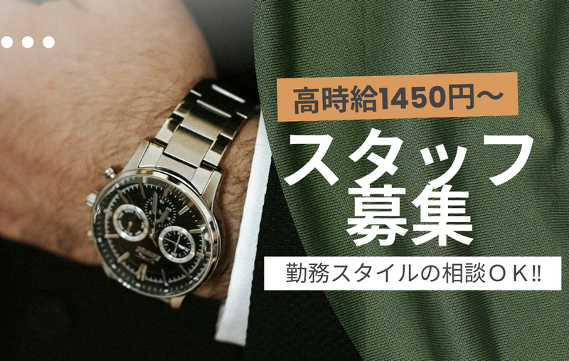 仕事内容 【仕事内容】 接客販売、商品管理、修理対応 レジ業務、梱包・ラッピング、店内清掃 ✨未経験歓迎 時計に関する知識がなくてもOK! 基礎知識から丁寧にレクチャーします* ✨個人ノルマなし 店舗予算に向かって協力プレーで 取り組んでいきます! 【服装規定】 スーツにパンプスでご勤務いただきます ✨オシャレOK 髪色やネイル、アクセは 華美なものでなければOK♪ オシャレも楽しめます! ✨社割あり 従業員の特権‼ いつでもお手頃価格で購入が可能◎ 【働き方】 フルタイム以外の応募も大歓迎‼ 扶養内、時短、曜日の固定など ライフスタイルに合わせて働けます* ✨インセンティブ制度 頑張りをしっかり評価○ 日々の努力をお給料に反映★