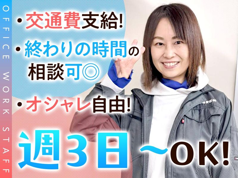仕事内容 基本的な事務作業をお願いします。 ●集計などのデータ入力 ●書類整理/ファイリング ●資料作り/営業日カレンダー作成 ●来客・メール・電話応対 など その他、SNS投稿などの 広報サポートやイベントのお手伝いもお任せします。 目立つ内容ではないけれど、 業務は多岐にわたります。 1つ1つが他の業務を支える大切な仕事なので 柔軟な対応ができると◎です! 【アピールポイント】 ✨サポート体制◎ 入社後はお仕事を覚えていただくまでは、 先輩社員がきちんとサポートします。 分からないことは その場で解決できる環境です。 「こんなこと聞いていいのかな?」 ということも遠慮なくどうぞ! ✨週3日~働ける! かけもちがしたいフリーターさんも、 家事をしながら働きたい主婦(夫)さんも、 大歓迎です◎ ✨時間は柔軟対応! 「子どもの送りがあるから、 もうちょっと遅くしたい」 「夜のバイトがギリギリになっちゃうから 終わるのをちょっと早めてほしい」 など、気軽にご相談ください♪