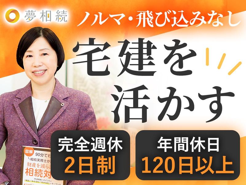 職場環境 \当社独自のコンサルティング/ 競合がほぼおらず、自身の知識・経験が活かせる とても専門性の高いお仕事を担っています。 税理士・司法書士の方とのやり取りもあるので、 実践の場で相続対策の専門知識がさらに身に付きます。