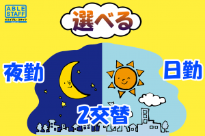 勤務時間 1. 7:00~15:30(実働7.75h) 2. 13:30~22:00(実働7.75h) 3. 8:30~17:00(実働7.75h) 4. 21:30~翌6:00(実働7.75h) ※1.2の交替勤務、3の日勤専属、4の夜勤専属、3.4の交替勤務より選べます