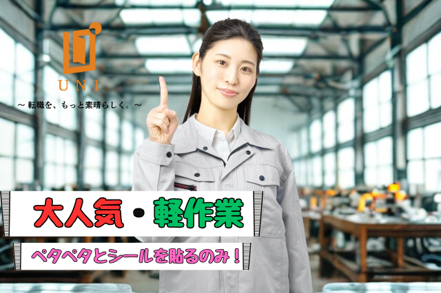 仕事内容 【ペタッ→キュッ→チェックのみ!】 ヘルメットやバイク部品にステッカーを貼り、磨いて、ズレがないか確認するだけ! まるでスマホの画面保護シートを貼るみたいに、慎重に、でも楽しく作業を進めていきます。 未経験者歓迎!丁寧な指導があるので安心してスタートできますよ✊ <担当営業からのおすすめポイント> 大手グループで安定して働ける ミドル世代から若い世代まで皆さん仲良くチームワーク抜群 適度に残業もあり稼げる <就業前の職場見学も可能です> 職場見学も随時開催中! 実際に職場を見てからゆっくりお考え下さい。 もちろん、我々もご同行しますのでご安心を♪ ⭐ユニファーストで働くメリット⭐ ユニファーストでは充実した福利厚生や、キャリアアップの為の研修制度など、 将来性を持って長く働けるよう、様々な制度があります! また、お仕事での悩みや生活に関するお困りごとも気軽に相談できる専用窓口もご用意◎ 「少し興味がある」「具体的な仕事内容は?」など、気になることがございましたら、お気軽にご連絡ください!